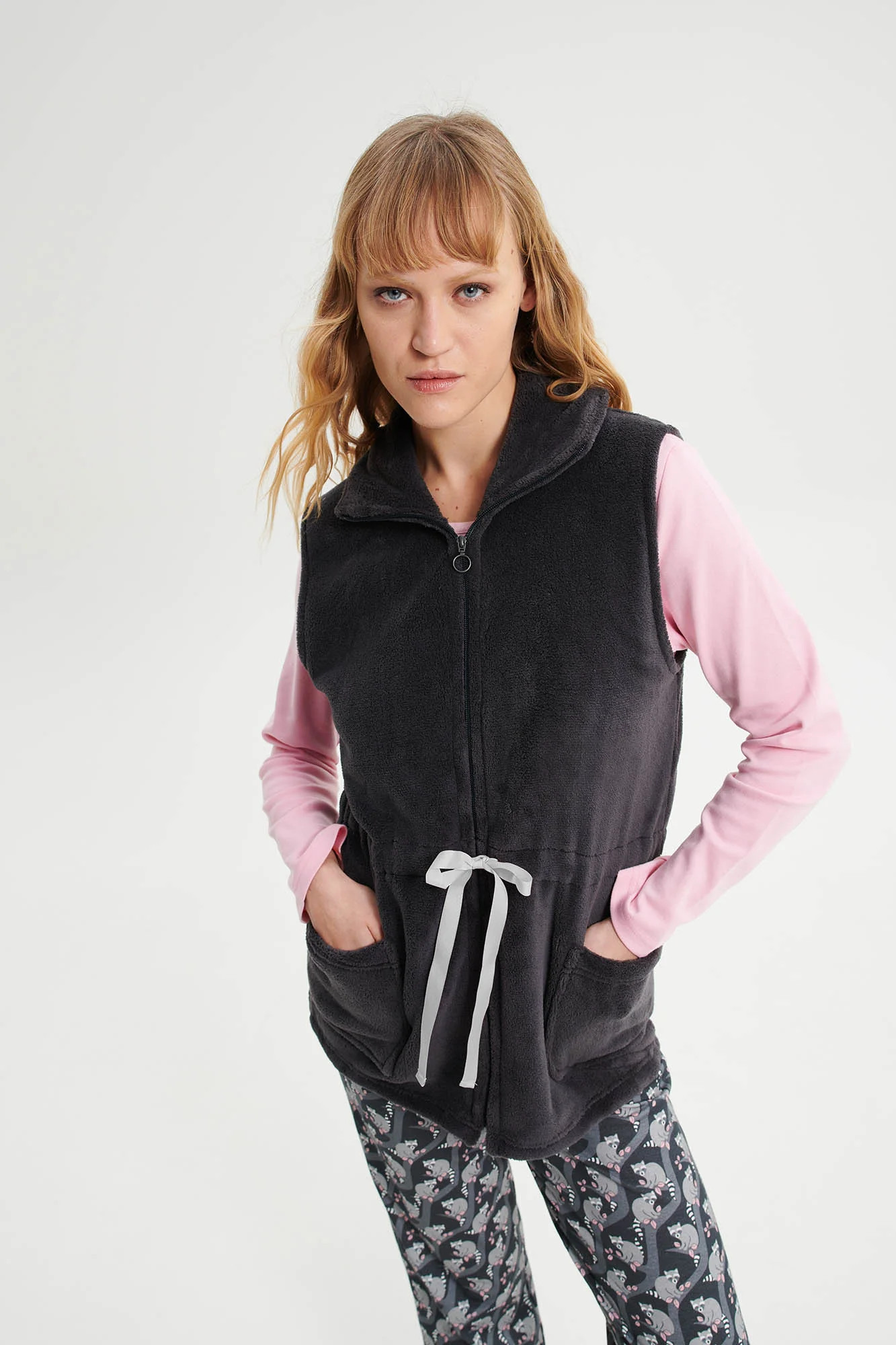Vesta: 100% polyester Coral Fleece Dĺžka: 70 cm. Model: výška 175 cm, veľkosť: Small. Dámska vesta na zips s golierom a nastaviteľným pásom je vyrobená z tkaniny jemnej na dotyk, ktorá poskytne pohodlie a pocit elegancie pre chvíle strávené doma.