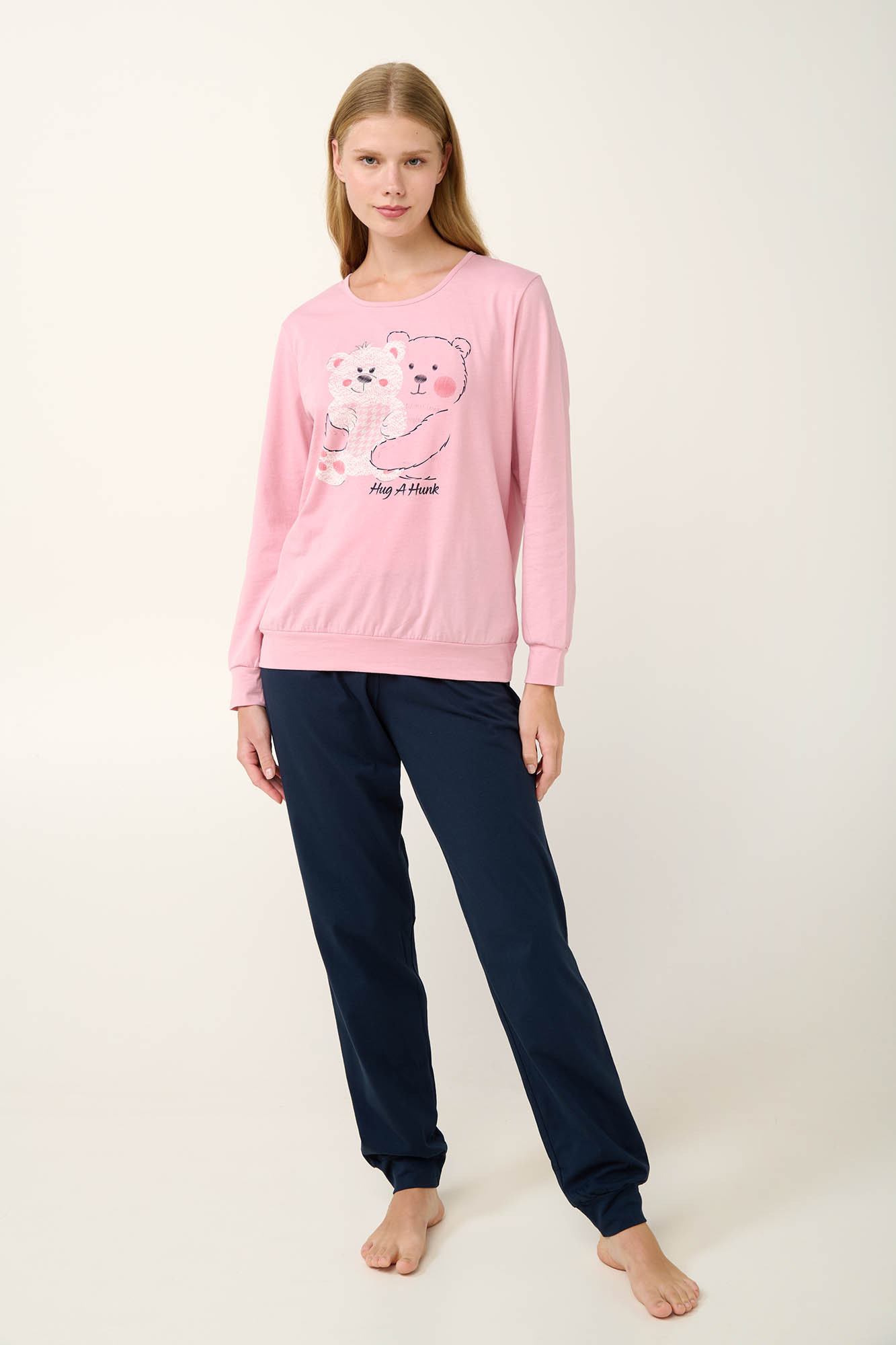 100% bavlna S. JerseyDĺžka topu: 65 cm.Model: výška 175 cm, veľkosť: Small.Dámske pyžamo vyrobené z jednoduchého džerseja zo 100 % bavlny, ktorý poskytuje mäkkosť a priedušnosť, ideálne na pokojný spánok. Súprava obsahuje hladké nohavice s manžetovými lemami a vrchný diel s roztomilou potlačou na prednej strane a dlhými manžetovými rukávmi. Táto súprava navrhnutá v regular fit strihu spája pohodlie a rozkošný pôvab.