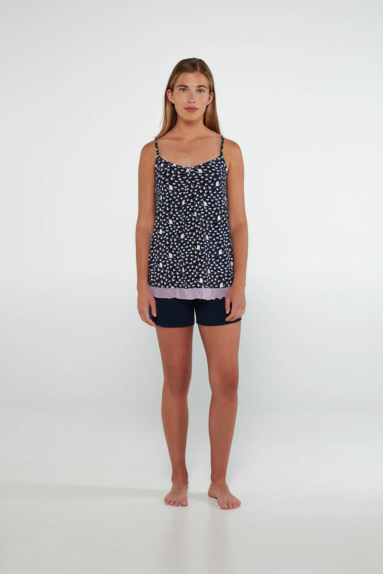 LENZING Tencel Modal Micro 93% + Elastan 7%.Dĺžka hornej časti: 65 cm.Model: výška 175 cm, veľkosť: small.Dámske pyžamo so špagetovými ramienkami, sieťovanými detailmi a hladkými krátkymi nohavicami. Je vyrobená z látky, ktorá je príjemná na dotyk a zaistí vám pohodlie počas celého dňa.