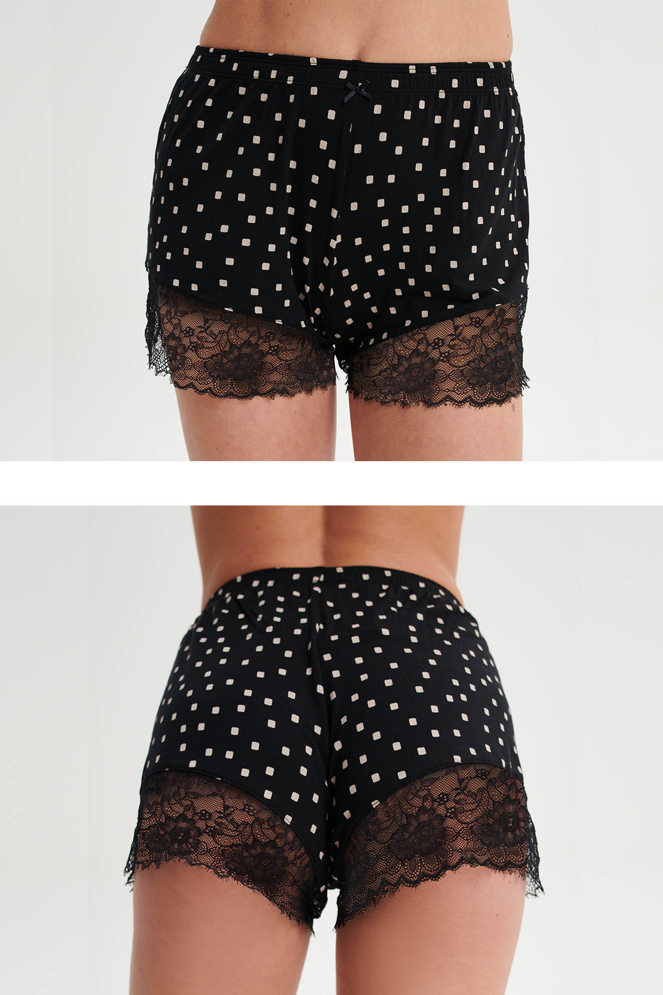 LENZING Tencel Modal Micro 93% + Elastan 7%. Modelka: výška 175 cm, veľkosť: Small.Dámske šortky s gumou v páse a krajkovým zakončením. Klasický návrh vyrobený z látky príjemnej na dotyk, ktorý vás bude tešiť dlhé roky.