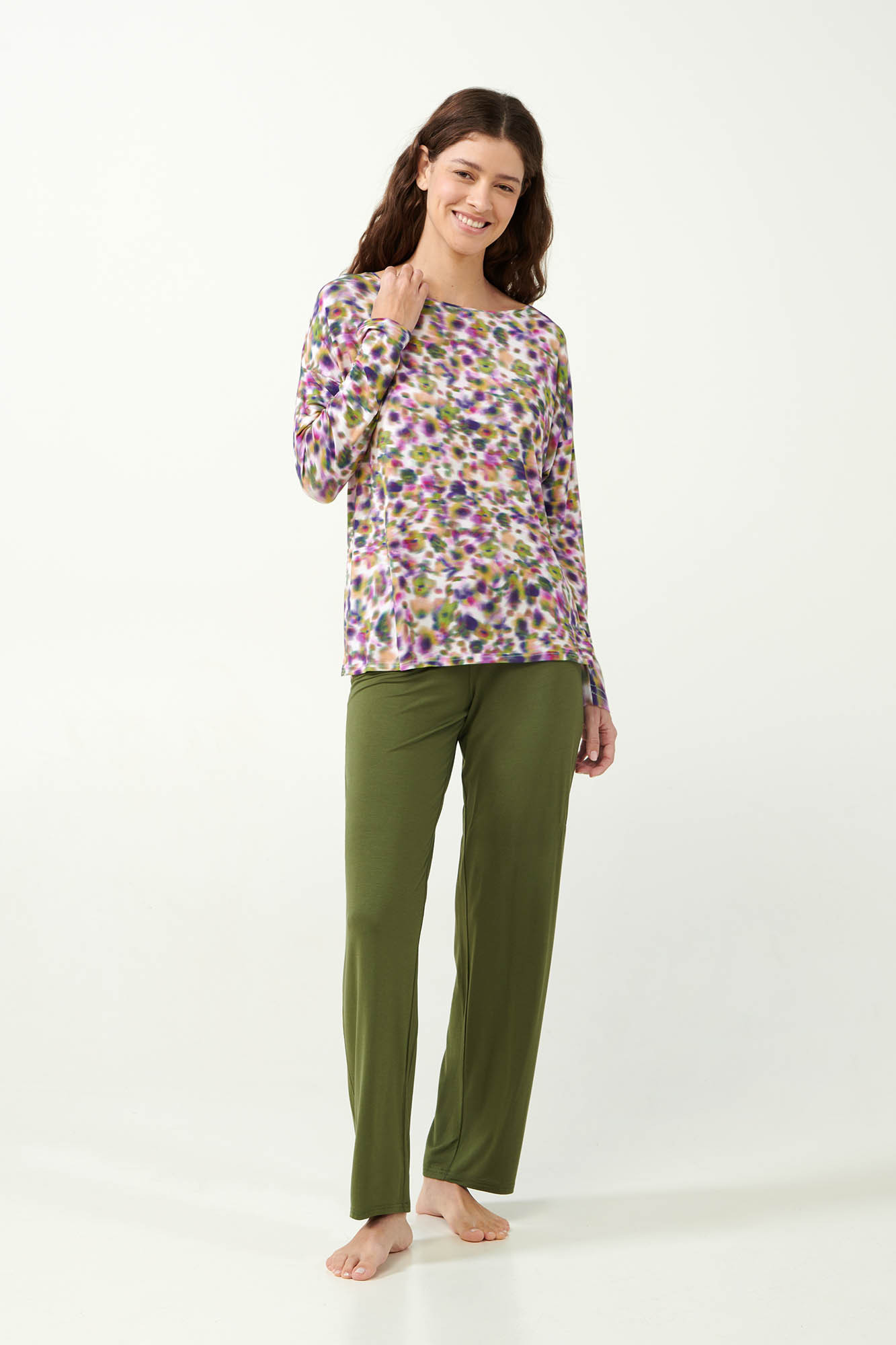 LENZING Tencel Modal Micro 93% + Elastan 7%.Dĺžka vrchného dielu: 65 cm.Model: výška 175 cm, veľkosť: Small.Dodajte svojej kolekcii nočného oblečenia nádych elegancie s naším dámskym pyžamom. Súprava obsahuje pastelový kvetinový vrchný diel v kombinácii s hladkými nohavicami v zelenom mechu, ktoré ponúkajú harmonickú kombináciu štýlu a pohodlia. Pyžamo je vyrobené z luxusného mikromodalu a poskytuje jemný a priedušný pocit na pokožke, ktorý zaručuje pokojné noci. Ideálne pre tých, ktorí na nočnom oblečení ocenia kombináciu klasického a moderného dizajnu.