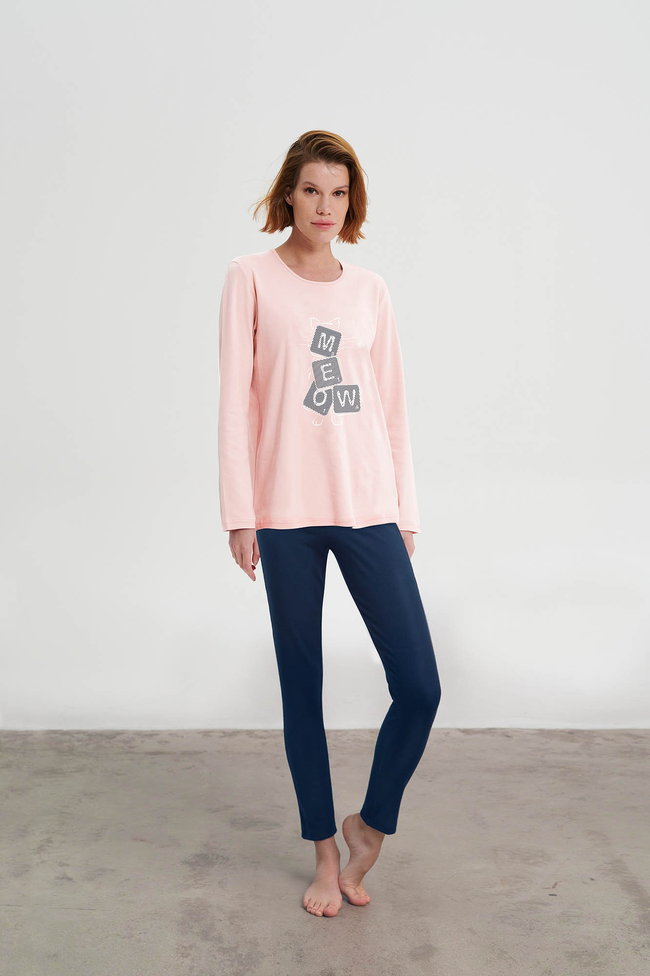 92% bavlna S. Jersey + 8% elastan.Dĺžka topu: 70 cm.Modelka má na sebe: Výška modelky: 175 cm.Vychutnajte si pohodlie a štýl s týmto dámskym zimným pyžamovým setom. Tento set obsahuje jednofarebné nohavice a vrchný diel s dlhými rukávmi s klasickým okrúhlym výstrihom a očarujúcou potlačou pre hravý nádych. Je vyrobený z bavlneného jednodielneho džerseja a ponúka mäkký pocit s jemnou elasticitou, takže je ideálny na relaxáciu alebo pokojný spánok. Jednodielne pyžamo je vyrobené z bavlny, ktorá je príjemná na dotyk.