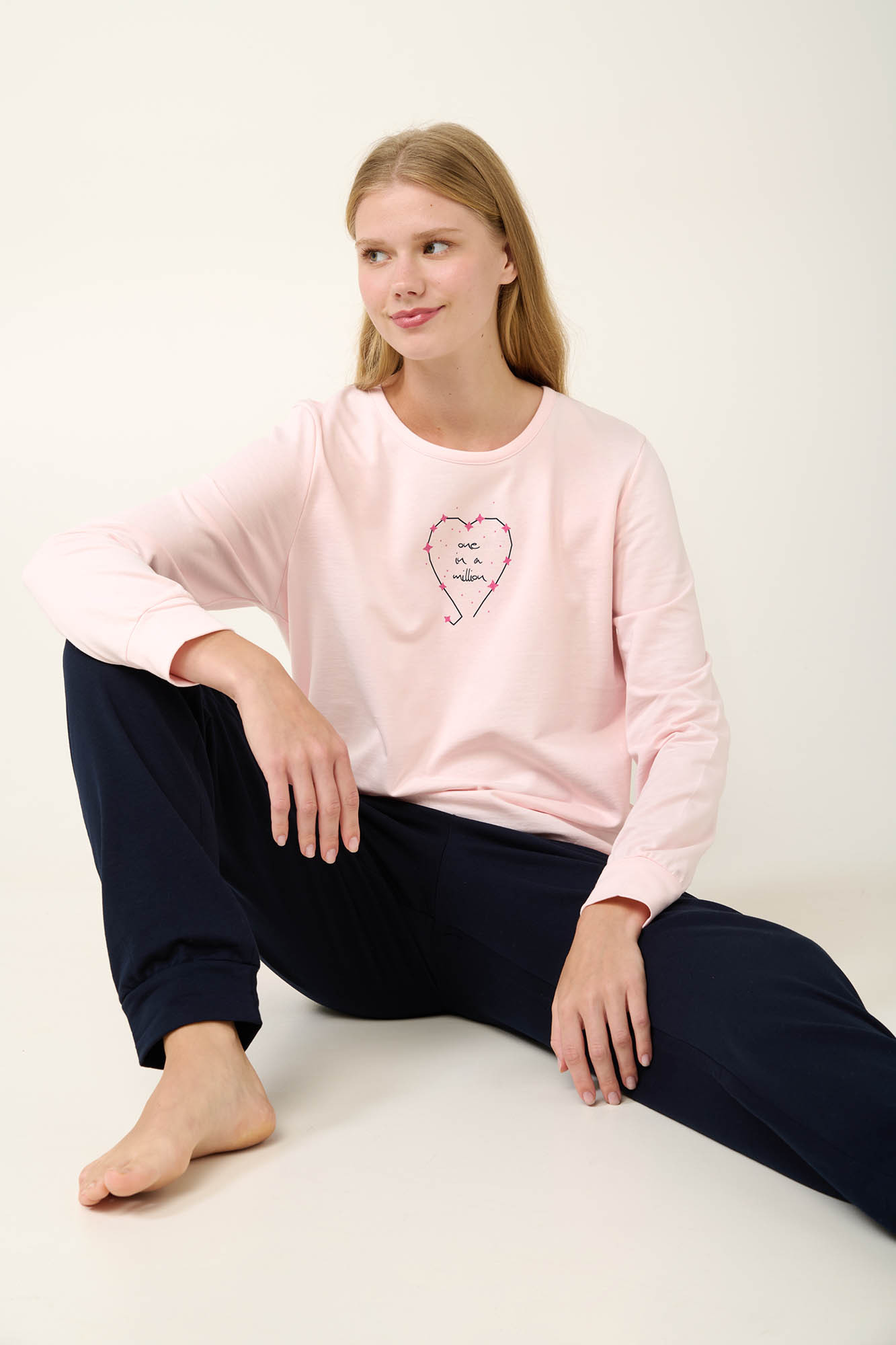 mikina zo 100% bavlny.Dĺžka vrchnej časti: 65 cm.Modelka má na sebe: Výška modelky: 175 cm.Buďte v teple a štýle s týmto dámskym pyžamom vyrobeným zo 100 % bavlneného termoflísu. Súprava má hladké nohavice s manžetami, ktoré ponúkajú pohodlné a bezpečné nosenie. Vrchný diel má manžety a rozkošnú potlač na hrudi, ktorá dodá vášmu domácemu oblečeniu hravý nádych. Vďaka regular strihu poskytuje toto pyžamo dokonalú rovnováhu medzi pohodlím a teplom, takže je ideálne na relaxáciu doma alebo pokojný spánok. .