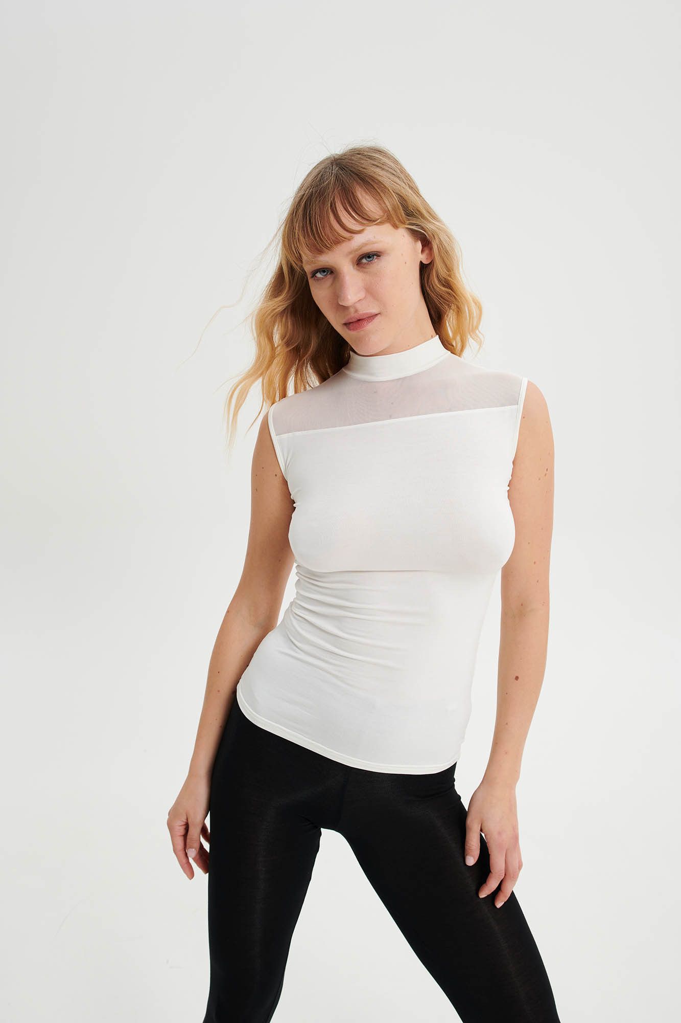 LENZING Tencel Modal Micro 93% + Elastan 7%. Dĺžka: 60 cm. Modelka: výška 175 cm, veľkosť: Small.Dámska košieľka bez rukávov, so sieťovanými detailmi a stojačikom. Klasická hladká voľba, ktorá vám poskytne pohodlie a luxus.