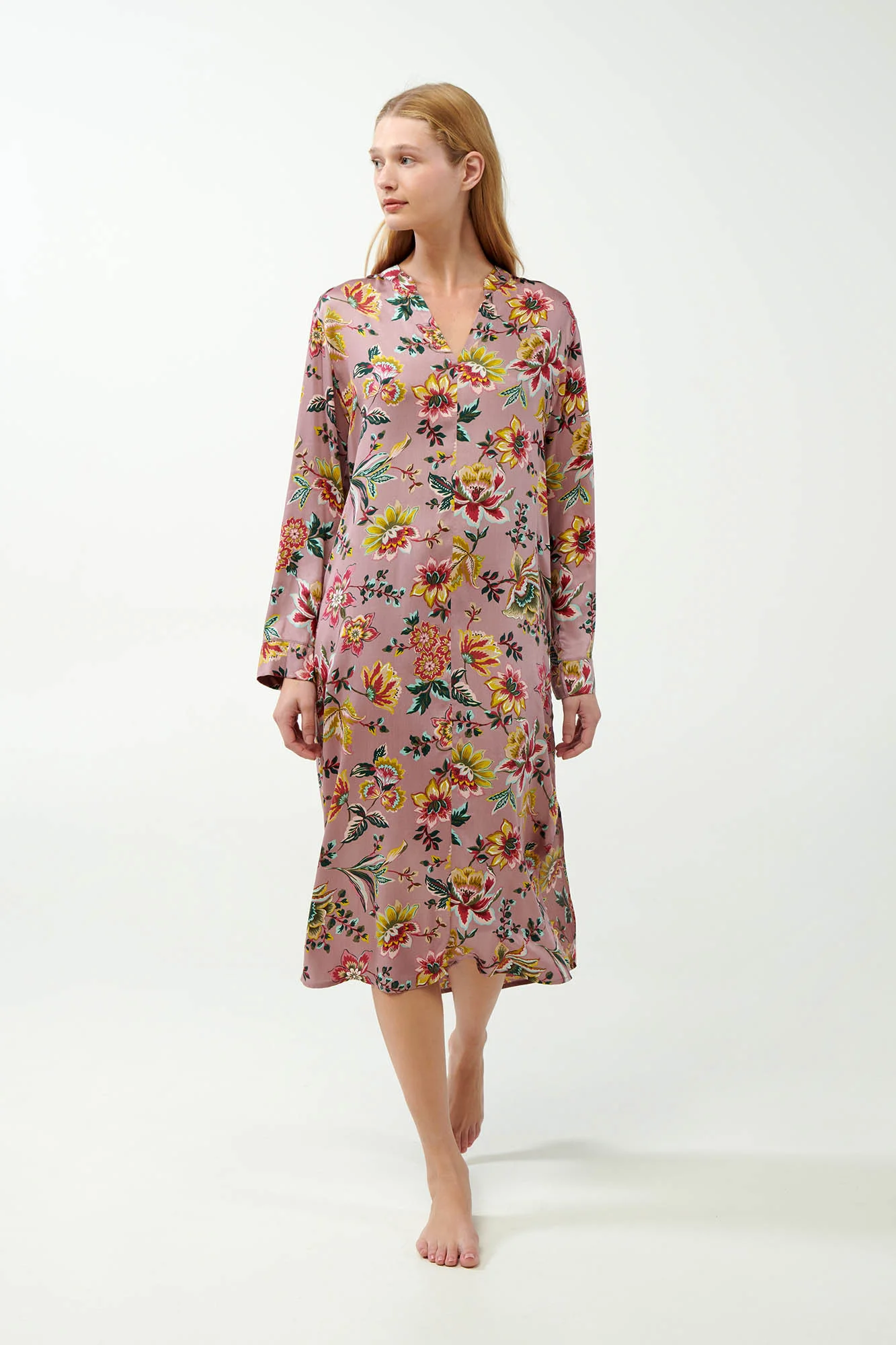 100% viskózový saténDĺžka: 120 cm.Model: výška 175 cm, veľkosť: Small.Vkĺznite do elegancie s touto ružovou dlhou nočnou košeľou, ktorú zdobí nadčasová potlač Jacobin. Výstrih do V dodáva košeli nádych ženskosti, zatiaľ čo riasenie na chrbte zvyšuje pohodlie a pohyblivosť. Nočná košeľa je navrhnutá v uvoľnenom strihu, ľahko sa oblieka a ponúka štýl aj ľahkosť. Je vyrobená z luxusného viskózového saténu a poskytuje jemný, hodvábny pocit, ktorý je ideálny na večerný relax. Objavte spojenie klasického dizajnu a moderného pohodlia v tomto nádhernom kúsku.