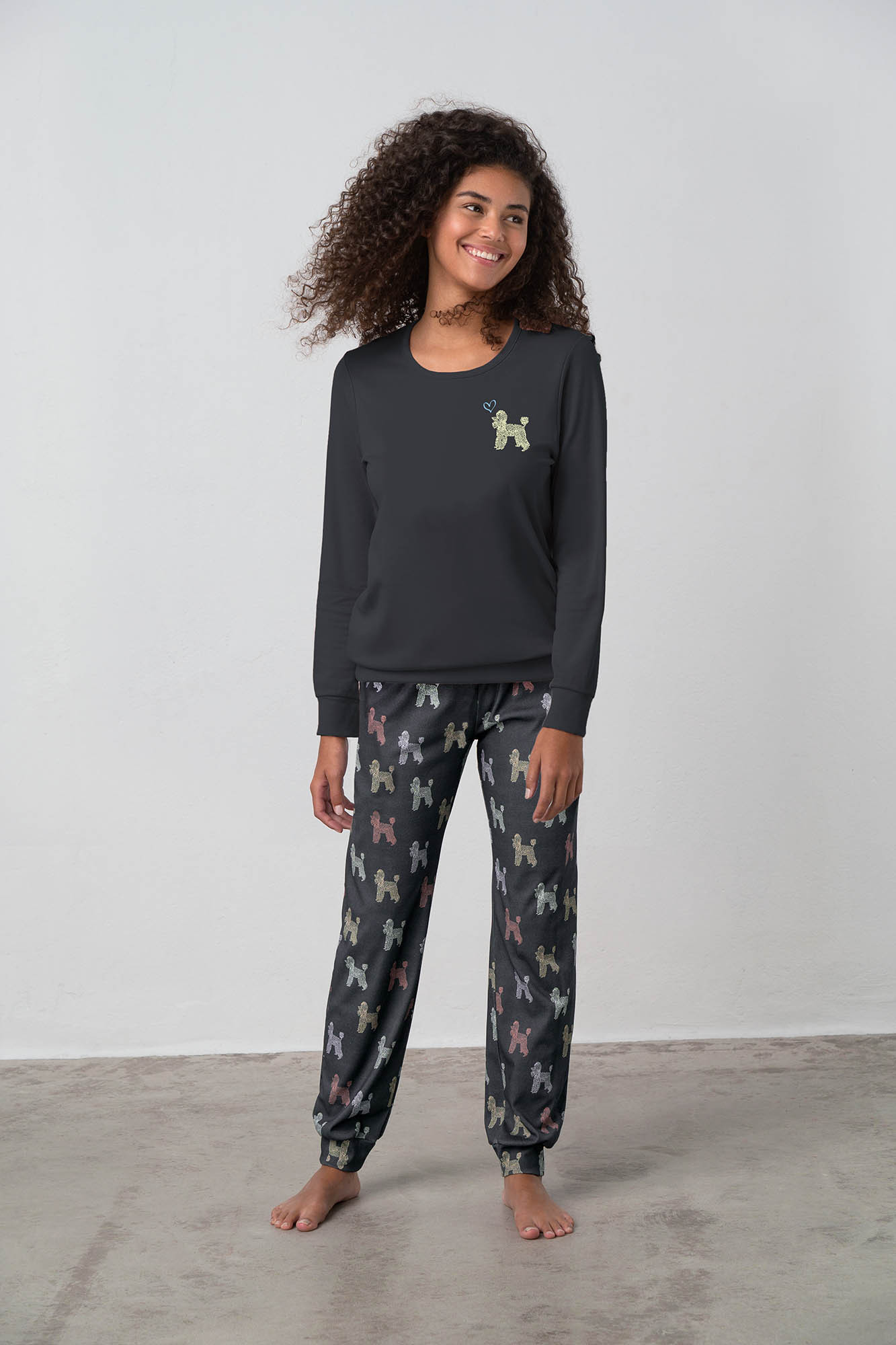 farba a vzor: ebony (ebenová), psíková potlač materiál: 100% polyester coral fleece horná časť: dlhý rukáv, okrúhly výstrih, s potlačou na prsiach dĺžka: 65 cm nohavice: dlhé s potlačou, manžety v zakončení modelka: výška 175 cm, veľkosť: Small (S) Pohodlné dámske pyžamo pre pohodlný spánok a voľný čas je vyrobené z ľahkého a hrejivého polyesterového vlákna, ktoré je objemné, mäkké a príjemné na dotyk, dobre udržuje telesnú teplotu a rýchlo schne. Oceníte v chladnejších dňoch.