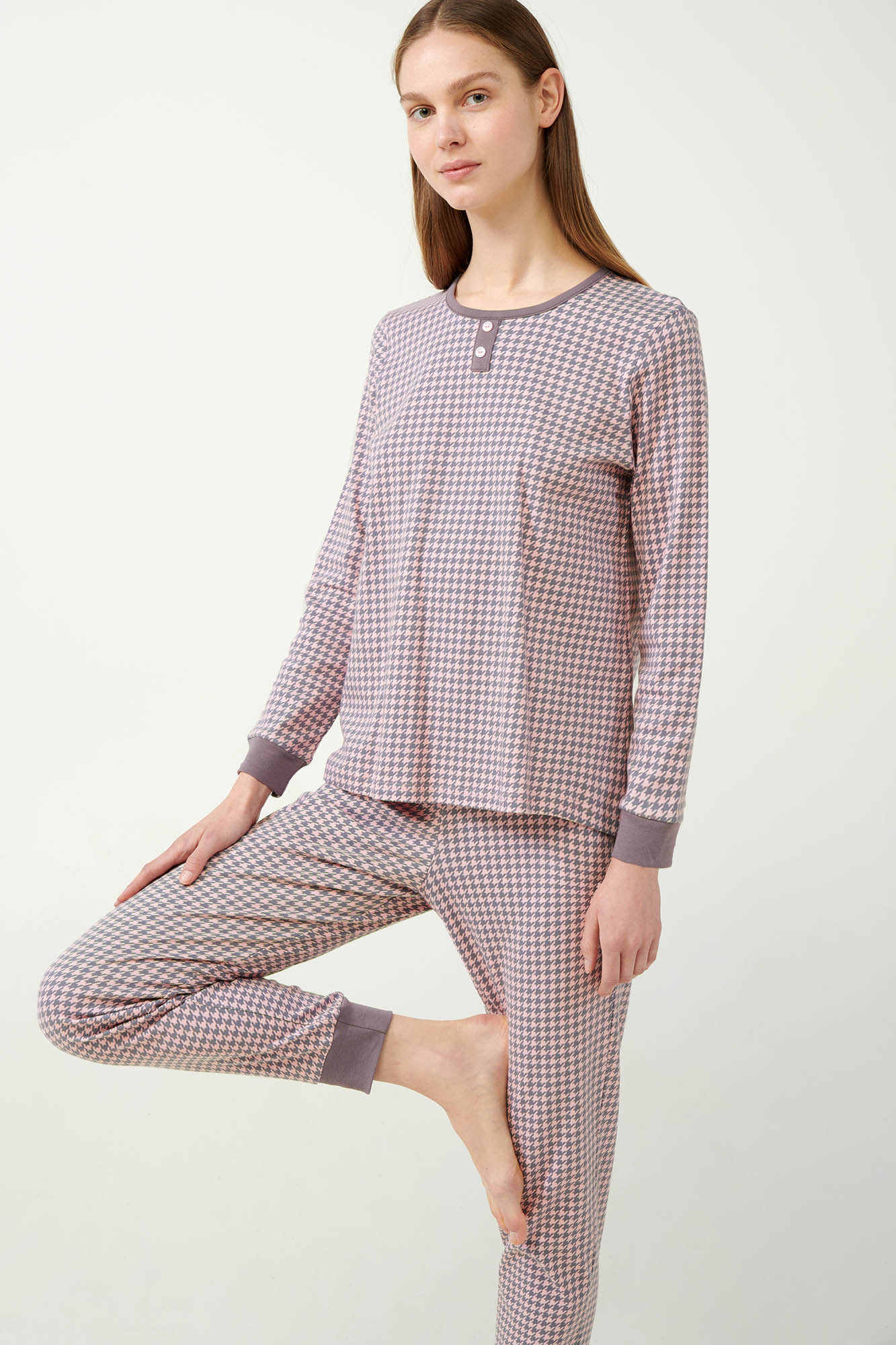 100% bavlna InterlockDĺžka vrchnej časti: 65 cm.Model: výška 175 cm, veľkosť: Small. Doprajte si dokonalé pohodlie s naším štýlovým dámskym pyžamom. Toto pyžamo s manžetami na nohaviciach a rukávmi s manžetami v elegantnom vzore pera ponúka modernú variáciu na klasické oblečenie na spanie. Pyžamo je vyrobené zo 100 % bavlny interlock a poskytuje výnimočnú mäkkosť a priedušnosť, takže je ideálne na pokojný spánok. Pyžamo má regular fit strih a poskytuje uvoľnenú, ale lichotivú siluetu, takže je ideálnou voľbou na príjemné noci a voľné rána. Vychutnajte si spojenie módy a pohodlia v tomto krásne navrhnutom pyžamovom komplete.