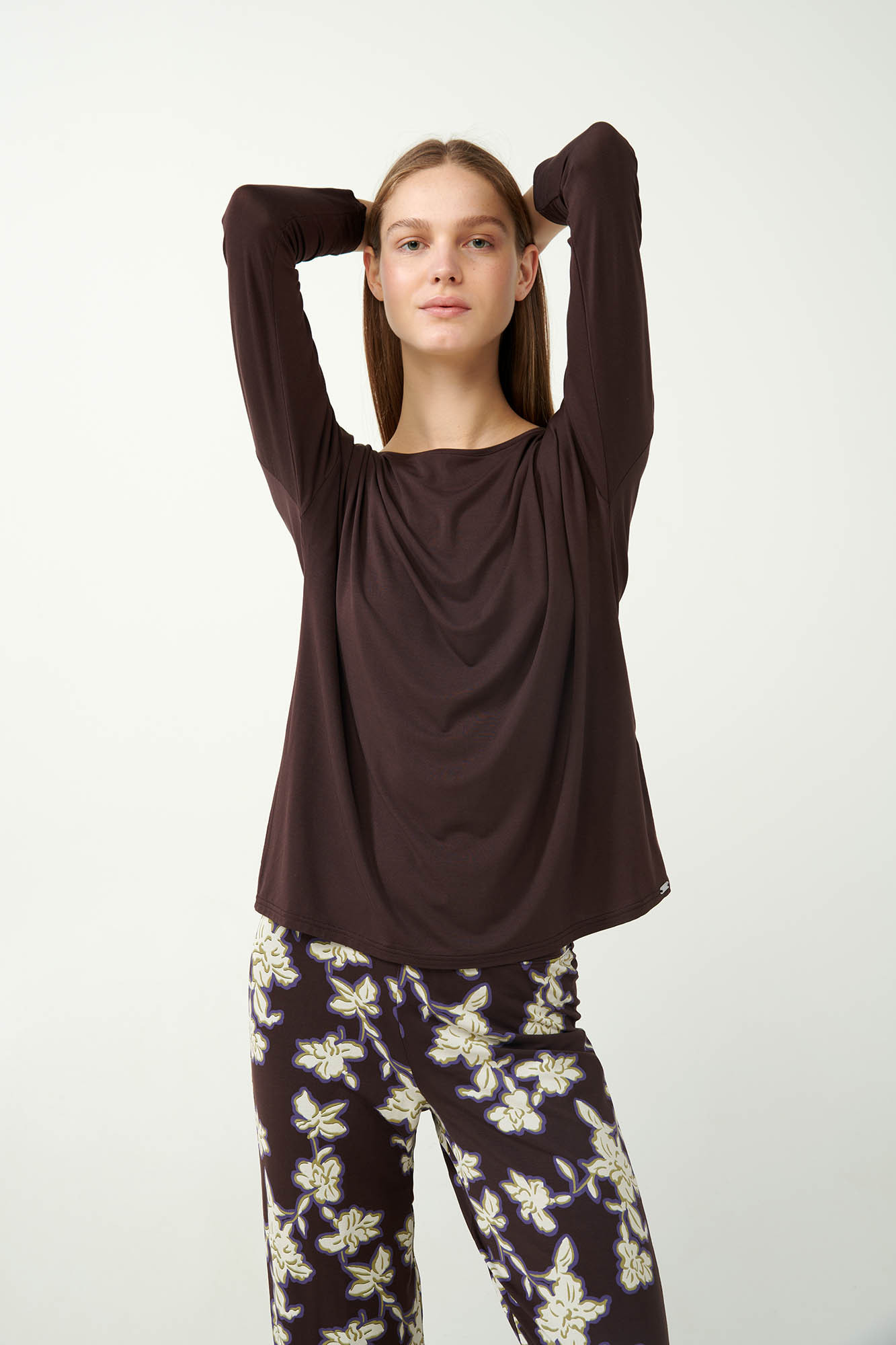 LENZING Tencel Modal Micro 93% + Elastan 7%.Dĺžka vrchného dielu: 65 cm.Model: výška 175 cm, veľkosť: Small.Zažite dokonalé pohodlie s touto dámskou pyžamovou súpravou, ktorá má hladký vrchný diel so širokým výstrihom a nádychom decentnej elegancie. Uvoľnený strih umožňuje ľahký pohyb a pohodlné nosenie, zatiaľ čo kvetinové nohavice dodajú vášmu nočnému oblečeniu šmrnc. Táto súprava je vyrobená z prvotriedneho mikromodalu a ponúka jemný, luxusný pocit na pokožke, ktorý vám zabezpečí pokojný spánok. Táto pyžamová súprava je ideálna pre tých, ktorí si cenia štýl aj pohodlie, a je skvelým doplnkom vašej zbierky spacieho oblečenia.