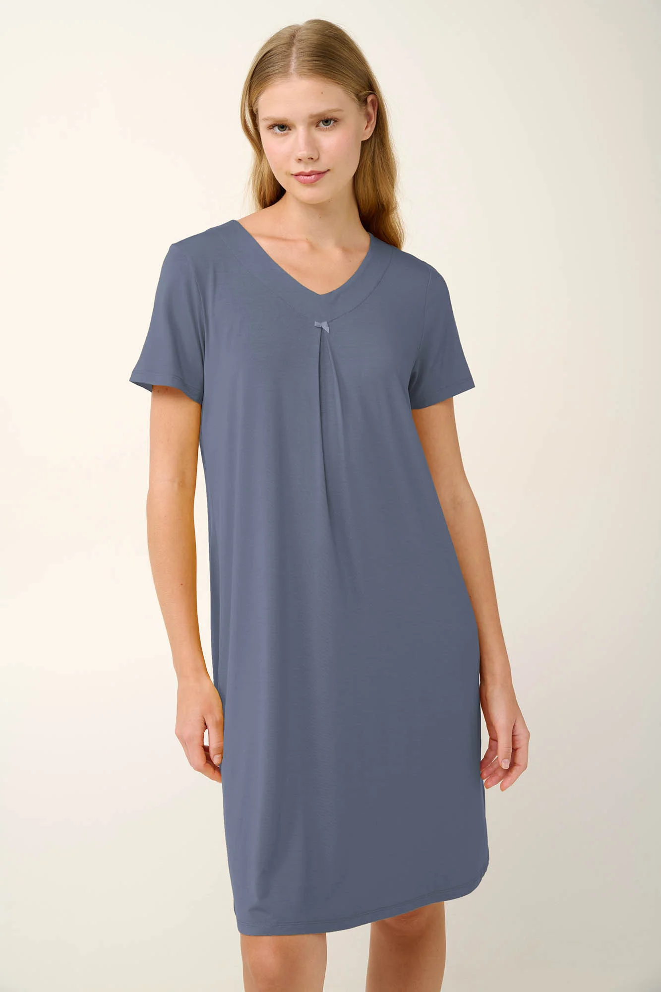 LENZING Tencel Modal Micro 93% + Elastan 7%.Dĺžka: 100 cm.Model: výška 175 cm, veľkosť: Small.Táto jednoduchá, ale elegantná letná nočná košeľa má klasický výstrih do V a krátke rukávy pre nadčasové pohodlie. Detail riasenia na prednej strane dodáva romantický nádych a ľahkosť, zatiaľ čo mäkká tkanina z mikromodalu zaručuje luxusný pocit. Ľahký, priedušný a neuveriteľne mäkký, tento nadčasový kúsok je ideálny na teplé noci a ponúka pohodlie aj decentný štýl pre pokojný spánok.