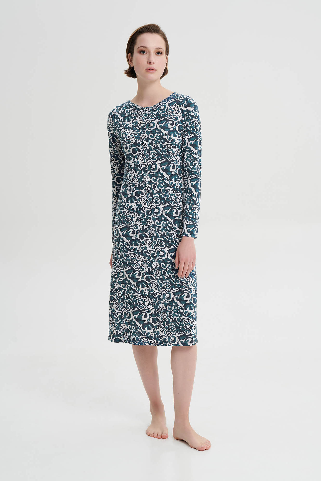 LENZING Tencel Modal Micro 93% + Elastan 7%.Dĺžka: 105 cm.Modelka: výška 175 cm, veľkosť: Small.Nočná košeľa s potlačou, okrúhlym výstrihom a dlhými rukávmi vo voľnom strihu. Príjemná kombinácia v modrých odtieňoch, ktorú budete nosiť po celý deň.