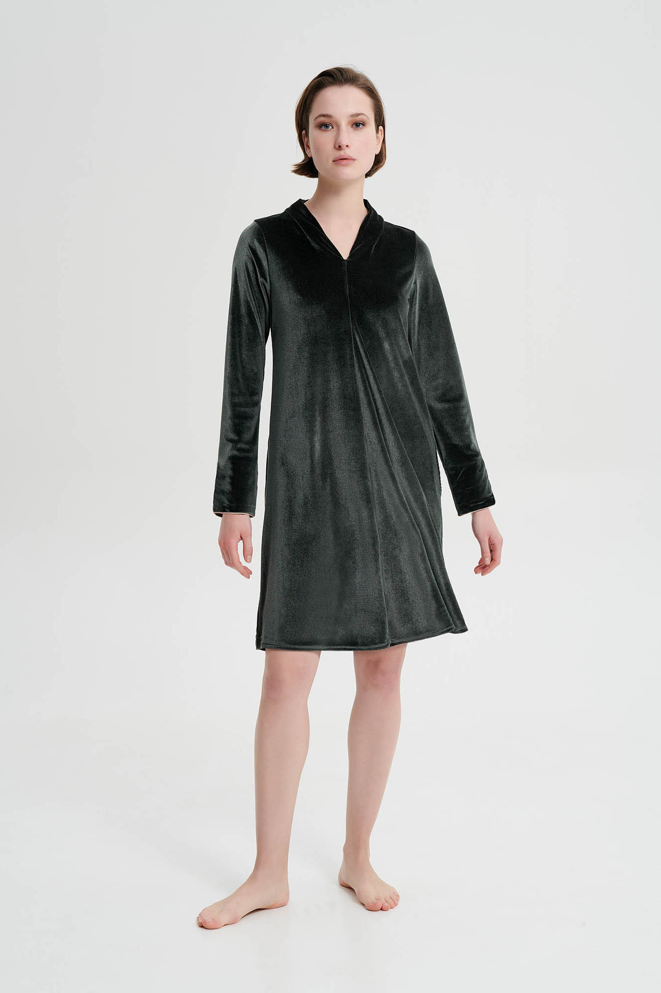 95% polyester - 5% elastan Dĺžka: 95 cm. Modelka nosí veľkosť Small a meria 175 cm.Jednofarebné šaty pohodlného strihu s výstrihom do V a dlhým rukávom. Vyrobené z mäkkej tkaniny na pohodlné domáce nosenie.
