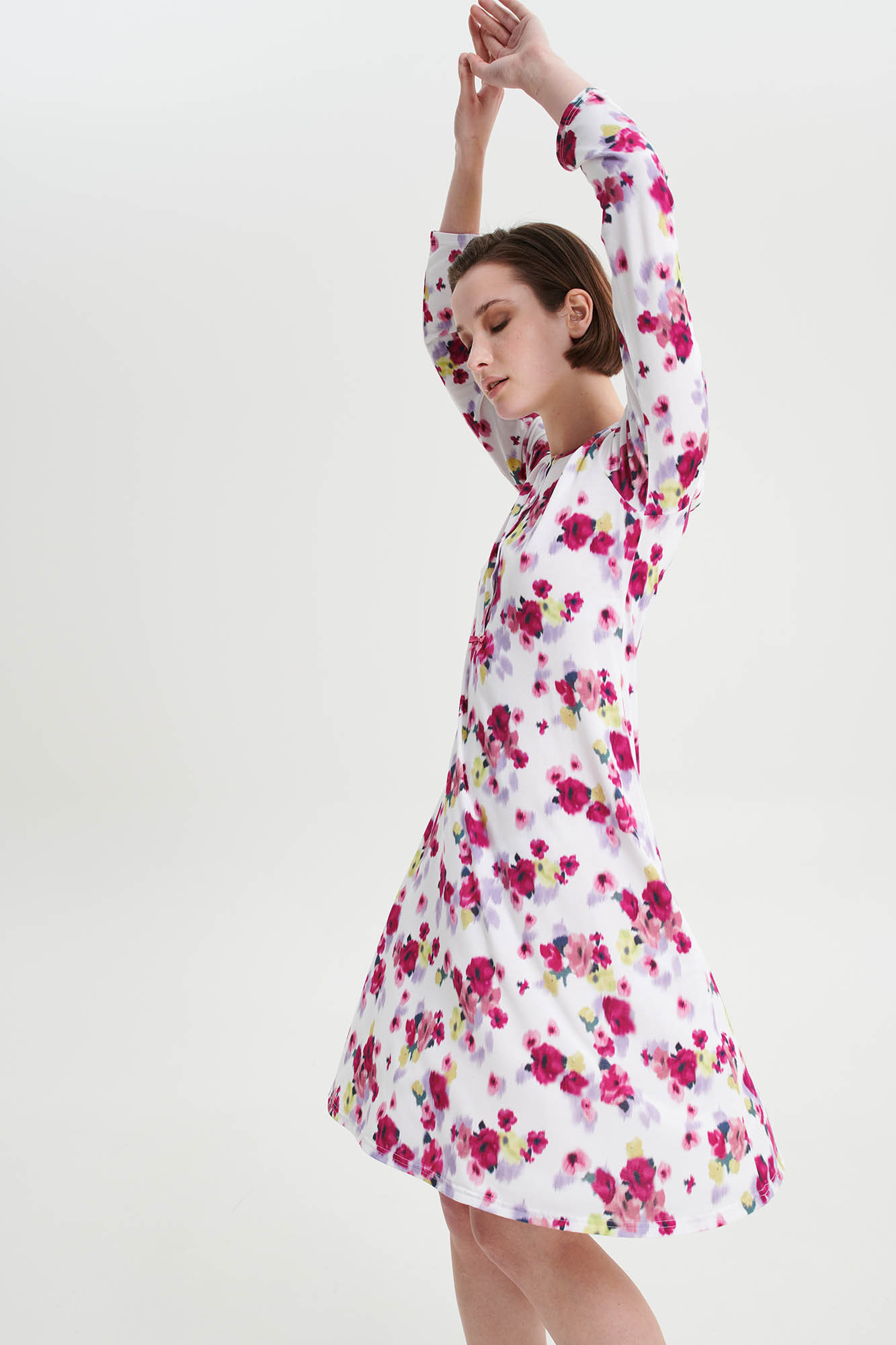 LENZING Tencel Modal Micro 93% + Elastan 7%.Dĺžka: 100 cm.Model: výška 175 cm, veľkosť: Small.Kvetinová nočná košeľa s gombíkovou légou a dlhými rukávmi. Nadčasová kvetinová potlač z materiálu príjemného na dotyk vám bude dobre slúžiť po celý deň.