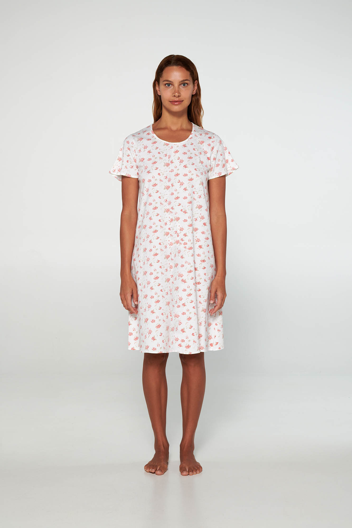 100% bavlna S. JerseyDĺžka: 100 cm.Model: výška 175 cm, veľkosť: small.Nočná košeľa s krátkymi rukávmi, okrúhlym výstrihom a voľným strihom. Romantický kvetinový vzor z chladnej tkaniny.
