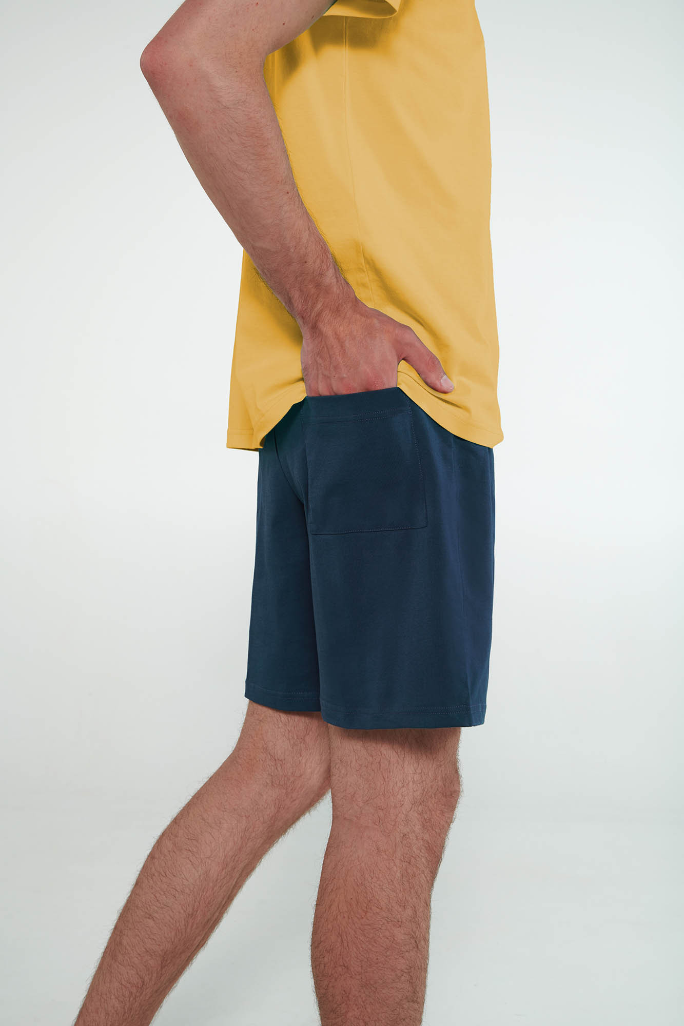 100% bavlna S. Jersey.Modelka má na sebe: 185 cm.Vychutnajte si pohodlie a pohodovú atmosféru s týmto pánskym letným pyžamom. Súprava obsahuje jednofarebné modré šortky so zadným vreckom a žiarivo žltý top s krátkym rukávom a okrúhlym výstrihom. Táto súprava regular fit je vyrobená zo 100 % bavlneného džerseja a ponúka mäkkosť a priedušnosť, takže je ideálna na leňošenie počas teplých dní alebo večerný relax. Podľa výrobcu je táto súprava vhodná pre každého, kto chce byť pohodlný.