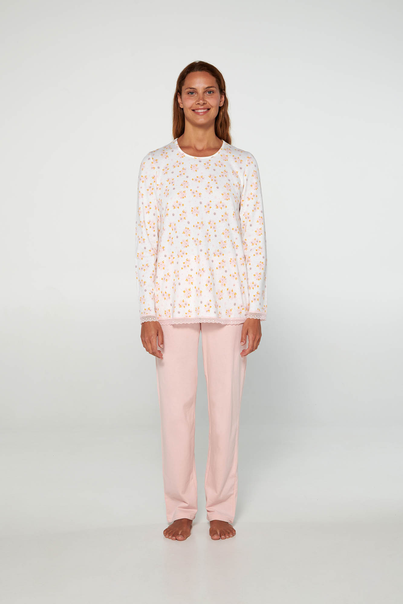100% Bavlnený Fleece Dĺžka vŕšku: 70 cm. Modelka: výška 175 cm, veľkosť: Small.Pohodlné dámske pyžamo s okrúhlym výstrihom, kvetinovou potlačou a krajkovými detailmi. Jednofarebné nohavice voľného strihu, vyrobené z hrejivej bavlny na chladné zimné dni.