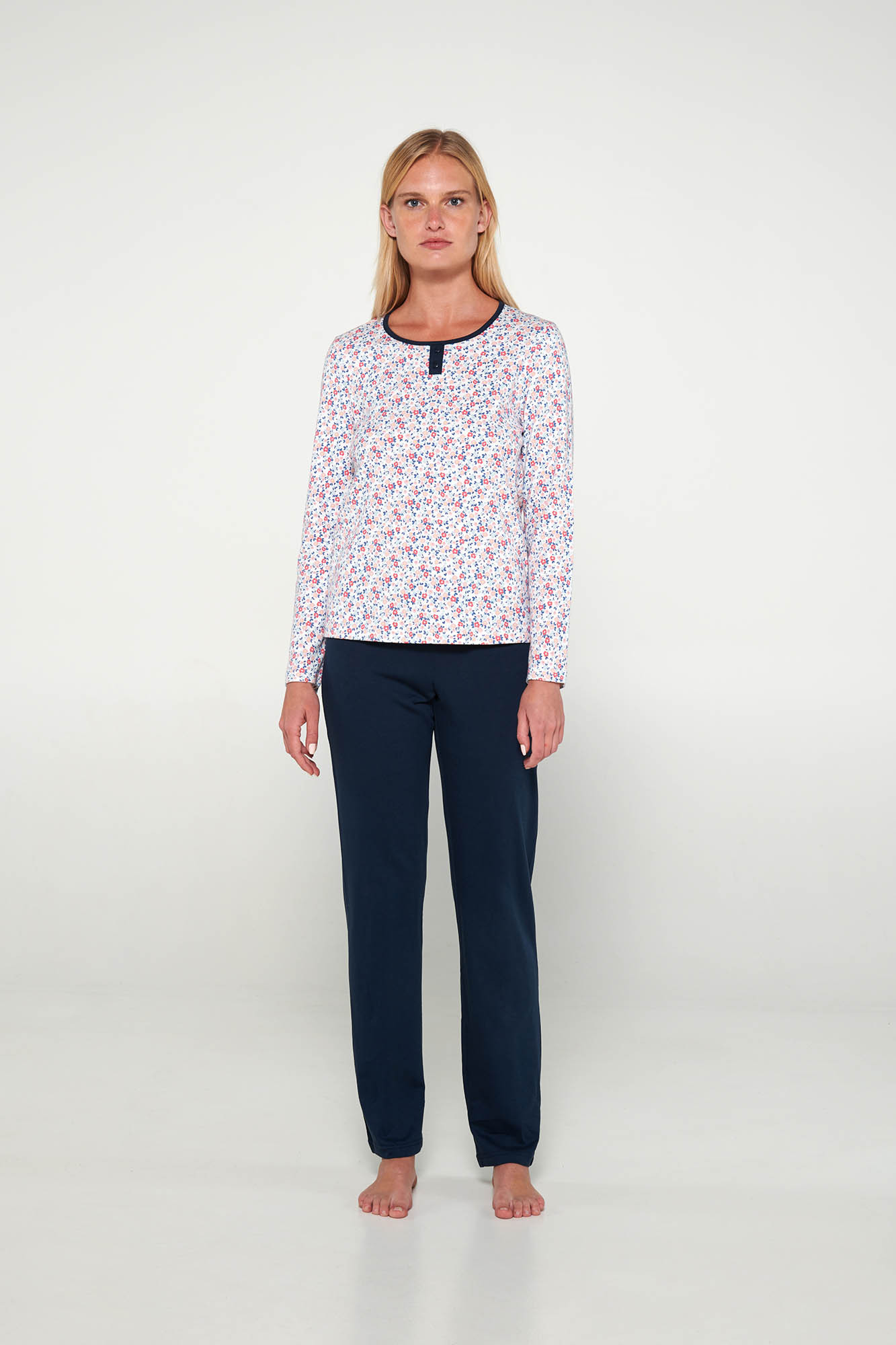 Horná časť: 100% Bavlna Interlock Nohavice: 50% Bavlna + 50% Modal Dĺžka vŕšku: 65 cm.Modelka: výška 175 cm, veľkosť: Small.Dámske pyžamo s dlhým rukávom, gombíkovou légou a kvetinovou potlačou.Vyrobené z vysoko kvalitnej prírodnej bavlny, ktorá poskytuje pohodlie, príjemný pocit na dotyk, priedušnosť, pružnosť a odolnosť.