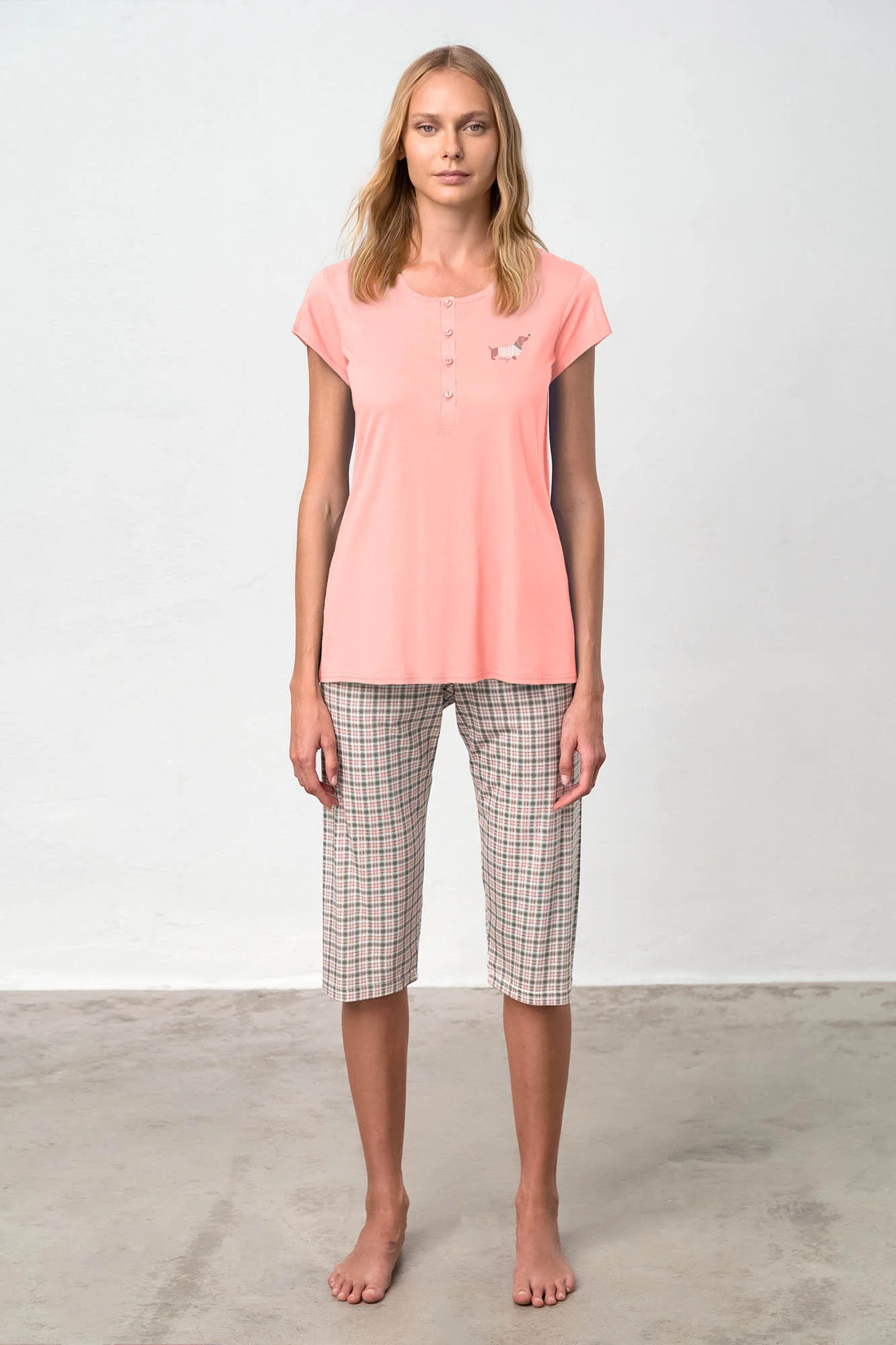 S. Jersey 50% bavlna + 50% modalDĺžka topu: 68 cm.Modelka má na sebe: Výška modelky: 175 cm.Dámske pyžamo s gombíkovou légou, krátkymi rukávmi a kockovanými kapri nohavicami. Príjemný letný dizajn z mäkkej zmesovej tkaniny.Príjemné letné oblečenie.
