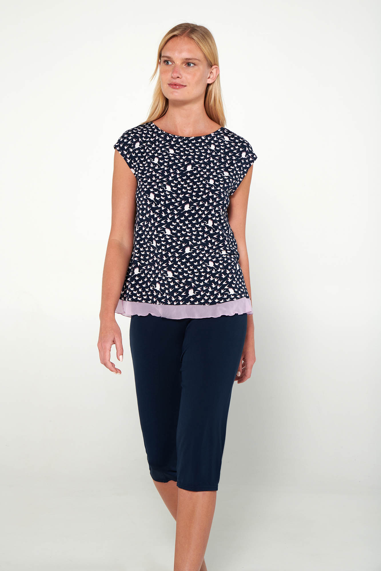 LENZING Tencel Modal Micro 93% + Elastan 7%.Dĺžka hornej časti: 68 cm.Model: výška 175 cm, veľkosť: small.Dámske pyžamo so spadnutými rukávmi, sieťovanými detailmi a hladkými kapri nohavicami. Je vyrobená z tkaniny príjemnej na dotyk, ktorá vám poskytne pohodlie počas celého dňa.