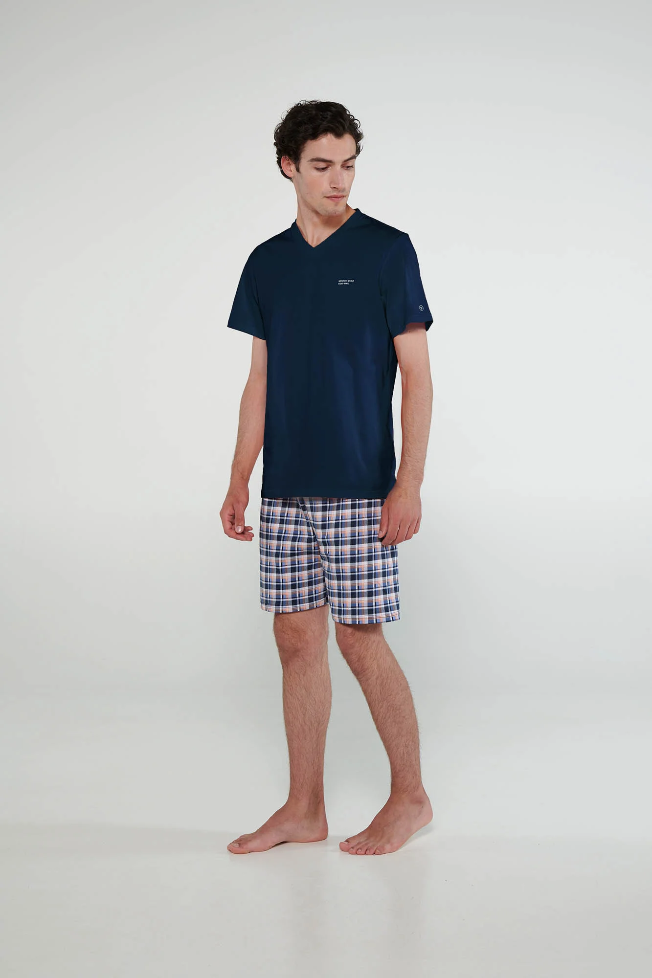 100% bavlna S. JerseyModel: výška 185 cm, veľkosť: medium.Pánske pyžamo s krátkymi rukávmi, výstrihom do V a krátkymi nohavicami. Svieže letné farby a tenká bavlna v károvanom dizajne s oranžovými detailmi pre lepšiu náladu.