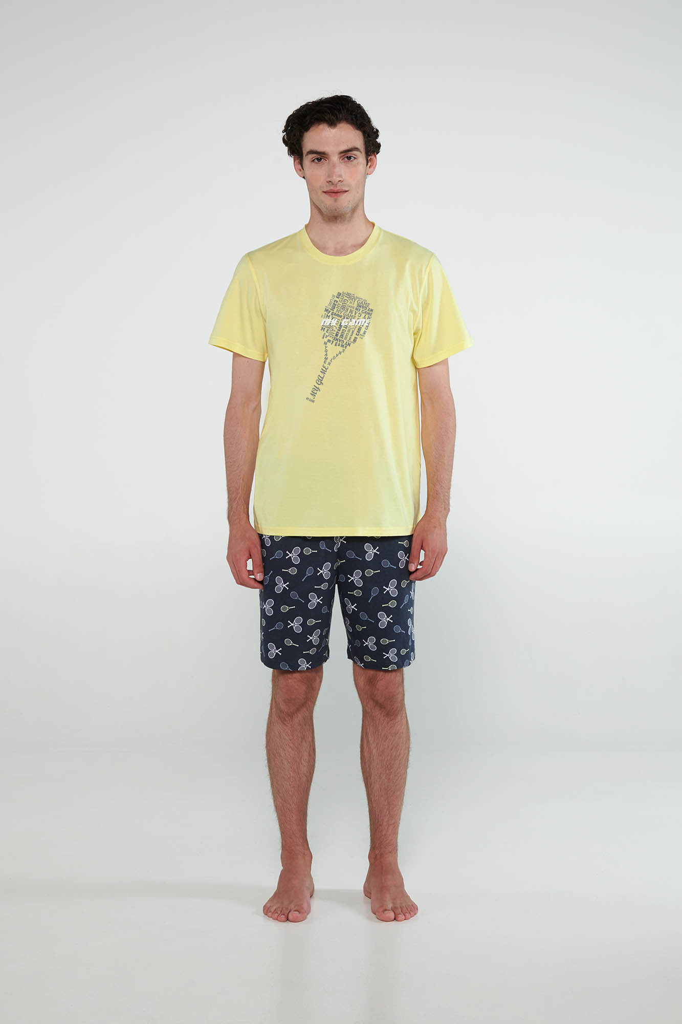 100% bavlna S. JerseyModel: výška 185 cm, veľkosť: medium.Pánske pyžamo s krátkymi rukávmi, okrúhlym výstrihom a potlačou, krátke nohavice. Pohodlná súprava, ktorá vám spríjemní letný spánok.