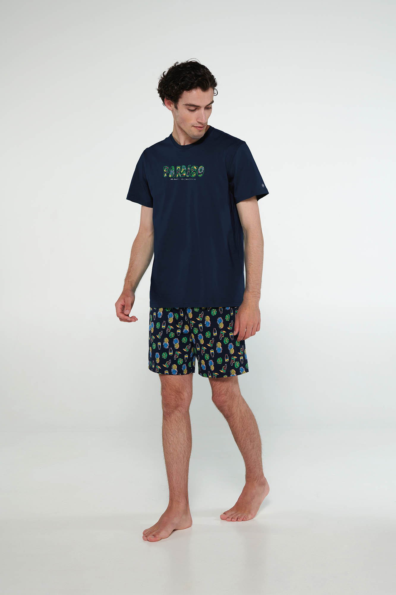 100% bavlna S. JerseyModel: výška 185 cm, veľkosť: medium.Pánske pyžamo s okrúhlym výstrihom a potlačou, krátke nohavice. Svieža a chladná, ako sa na letné dni patrí.