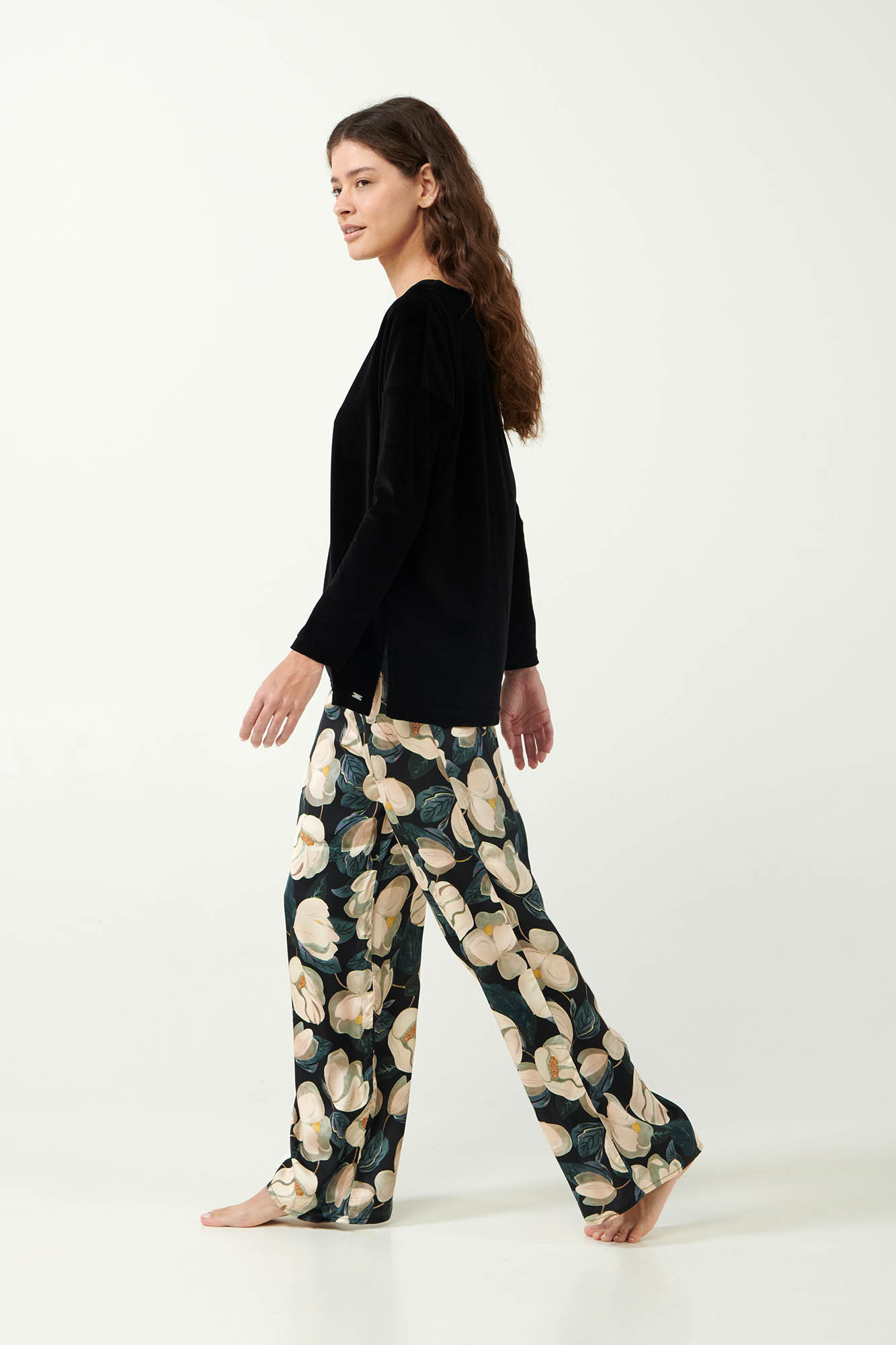 Vrchná časť: Polyester 95% + Elastan 5%Nohavice: 100% viskózový saténDĺžka topu: 70 cm.Modelka: výška 175 cm, veľkosť: Small.Táto dámska pyžamová súprava kombinuje hladký čierny zamatový top s nohavicami s podmanivou potlačou magnólie, ktoré ponúkajú luxus a pohodlie. Plyšový zamatový top poskytuje teplo a mäkkosť, zatiaľ čo nohavice z viskózového saténu majú hladkú, hodvábnu štruktúru pre uvoľnený strih. Kontrast medzi elegantným čiernym topom a živou kvetinovou potlačou na nohaviciach vytvára štýlovú a zároveň pohodlnú súpravu, ktorá je ideálna na večerný relax alebo dobrý spánok. Ideálna pre tých, ktorí si cenia eleganciu v oblečení na spanie.