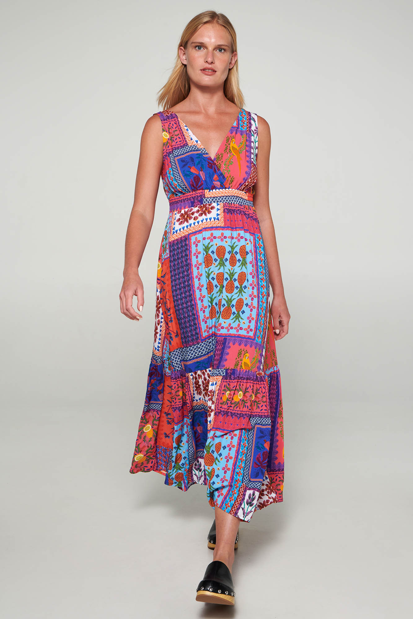 100% popelín - viskóza.Dĺžka: 135 cm.Model: výška 175 cm, veľkosť: small.Dlhé šaty s potlačou, véčkovým výstrihom a voľným chrbtom. Dodajú vám požadovanú sviežosť na začiatok dňa.