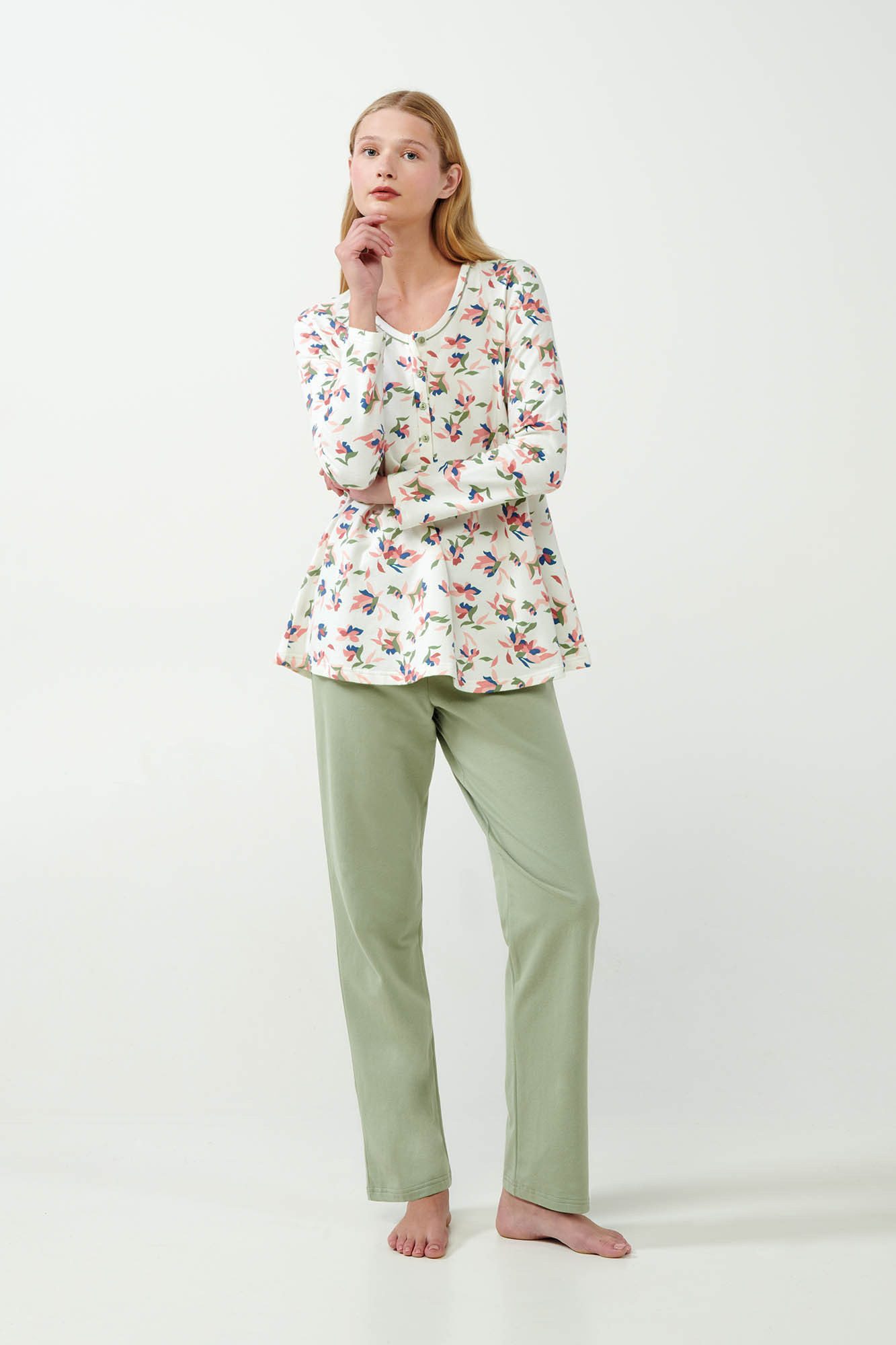 100% bavlnené rúnoDĺžka vrchnej časti: 70 cm.Model: výška 175 cm, veľkosť: Small.Objavte pohodlie a praktickosť s naším dámskym pyžamom pre tehotné a dojčiace ženy. Toto pyžamo má voľný strih a praktickú gombíkovú légu na jednoduché dojčenie a je vyrobené zo 100 % bavlneného termoflísu pre maximálnu mäkkosť. Pastelová kvetinová potlač dodáva pyžamu eleganciu. Táto súprava je ideálna na nosenie počas tehotenstva aj po ňom, udrží vás v pohodlí a štýle.