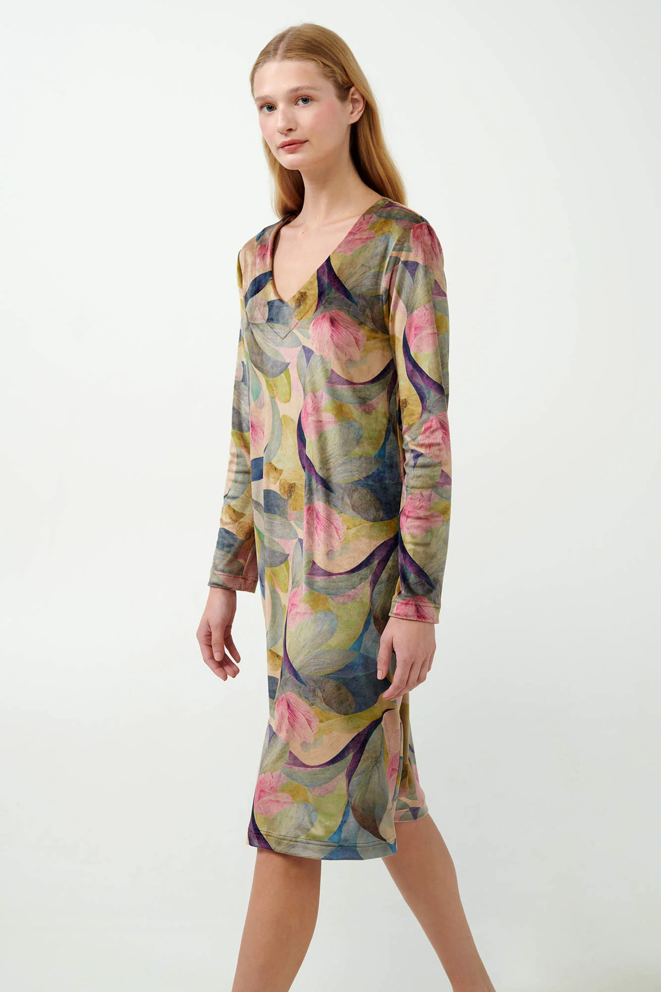95% polyester + 5% elastanDĺžka: 105 cm.Model: výška: 175 cm, veľkosť: Small.Zažite dokonalé pohodlie a štýl s našimi zimnými šatami, ktoré sú vyrobené z plyšového elastického velúru so žiarivou kvetinovou potlačou protey. Výstrih do V dodáva šatám nádych elegancie, zatiaľ čo uvoľnený strih zaručuje ľahkosť pohybu a lichotivú siluetu. Tieto šaty sú ideálne na príjemné dni doma alebo na bežné výlety, spájajú luxusnú mäkkosť s pútavým dizajnom, takže sú elegantnou a pohodlnou voľbou na každý deň.