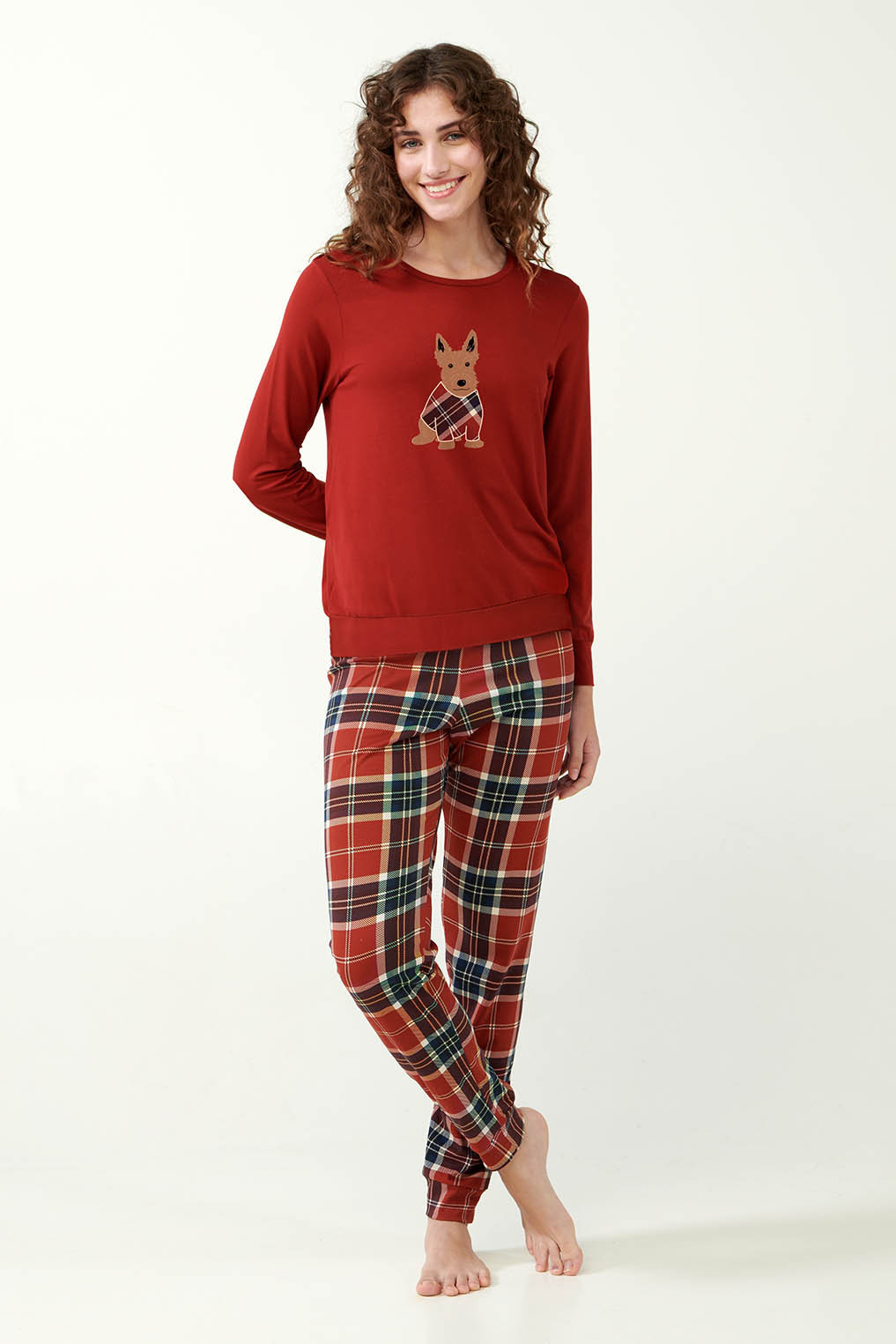100 % bavlna Interlock.Dĺžka vrchného dielu: 65 cm.Model: výška 175 cm, veľkosť: Small.Pre celú rodinuOslávte sviatky so svojimi blízkymi v našom vianočnom dámskom pyžame. Táto súprava, ktorá obsahuje pohodlné nohavice s manžetami s klasickým modro-červeným tartanom a mäkký vrchný diel zdobený slávnostnou potlačou škótskeho teriéra, je ideálna na koordináciu rodinných chvíľ pri stromčeku alebo pri krbe. Je vyrobená zo 100 % bavlneného interloku a je navrhnutá pre teplo, pohodlie a čarovné vianočné spomienky.