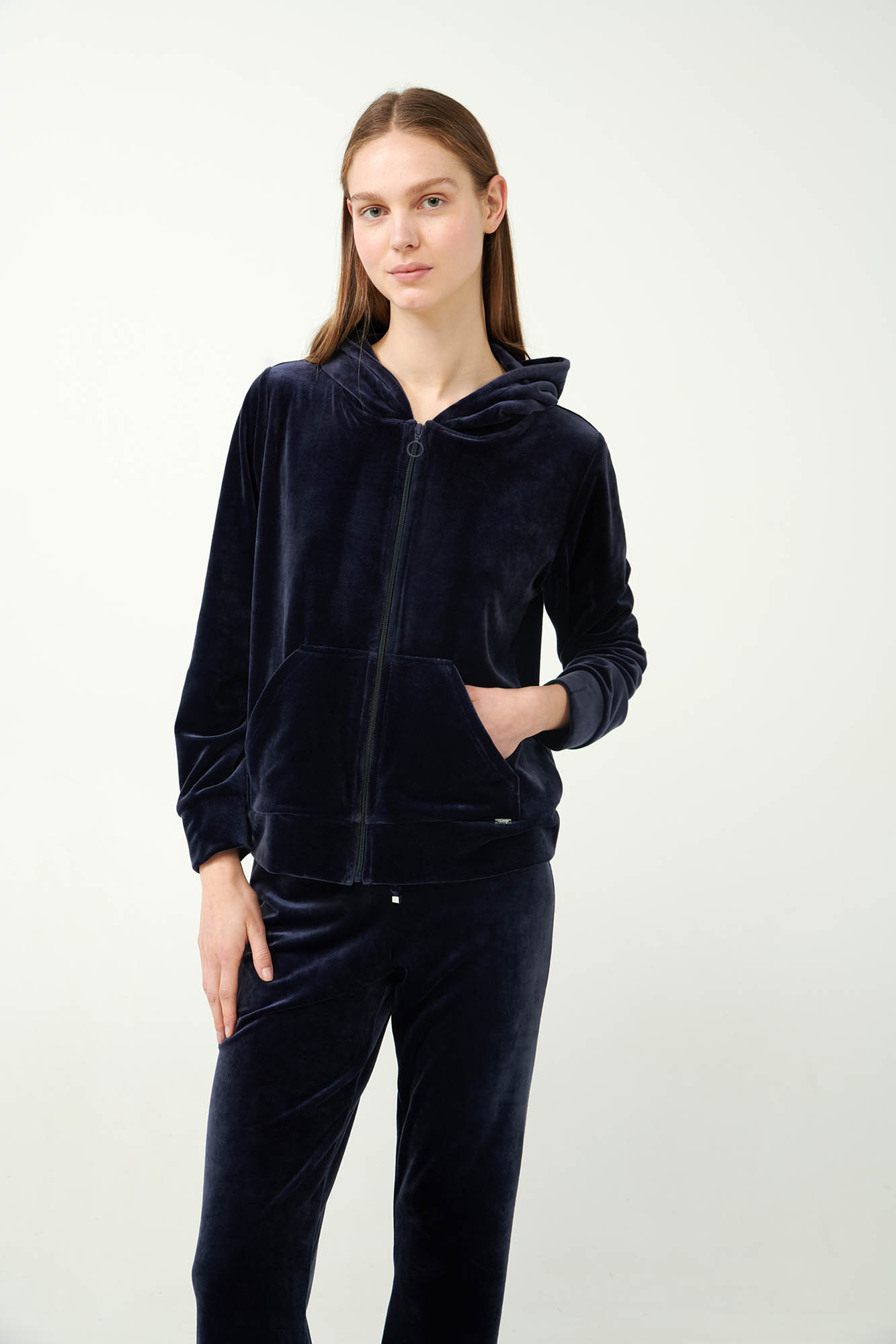 95% polyester + 5% elastanDĺžka vrchnej časti: 65 cm.Model: výška 175 cm, veľkosť: Small.Táto tepláková súprava z hladkého elastického velúru vám zaistí pohodlie a štýl. Vrchná časť je vybavená príjemnou kapucňou a praktickými vreckami, ktoré poskytujú teplo aj funkčnosť. Je vyrobená z plyšového elastického velúru a ponúka luxusný pocit a uvoľnený strih, ktorý je ideálny na leňošenie alebo bežné výlety. Jej elegantný, minimalistický dizajn zaručuje, že sa bez problémov začlení do každého bežného šatníka. Vylepšite svoje každodenné nosenie touto elegantnou a pohodlnou teplákovou súpravou.