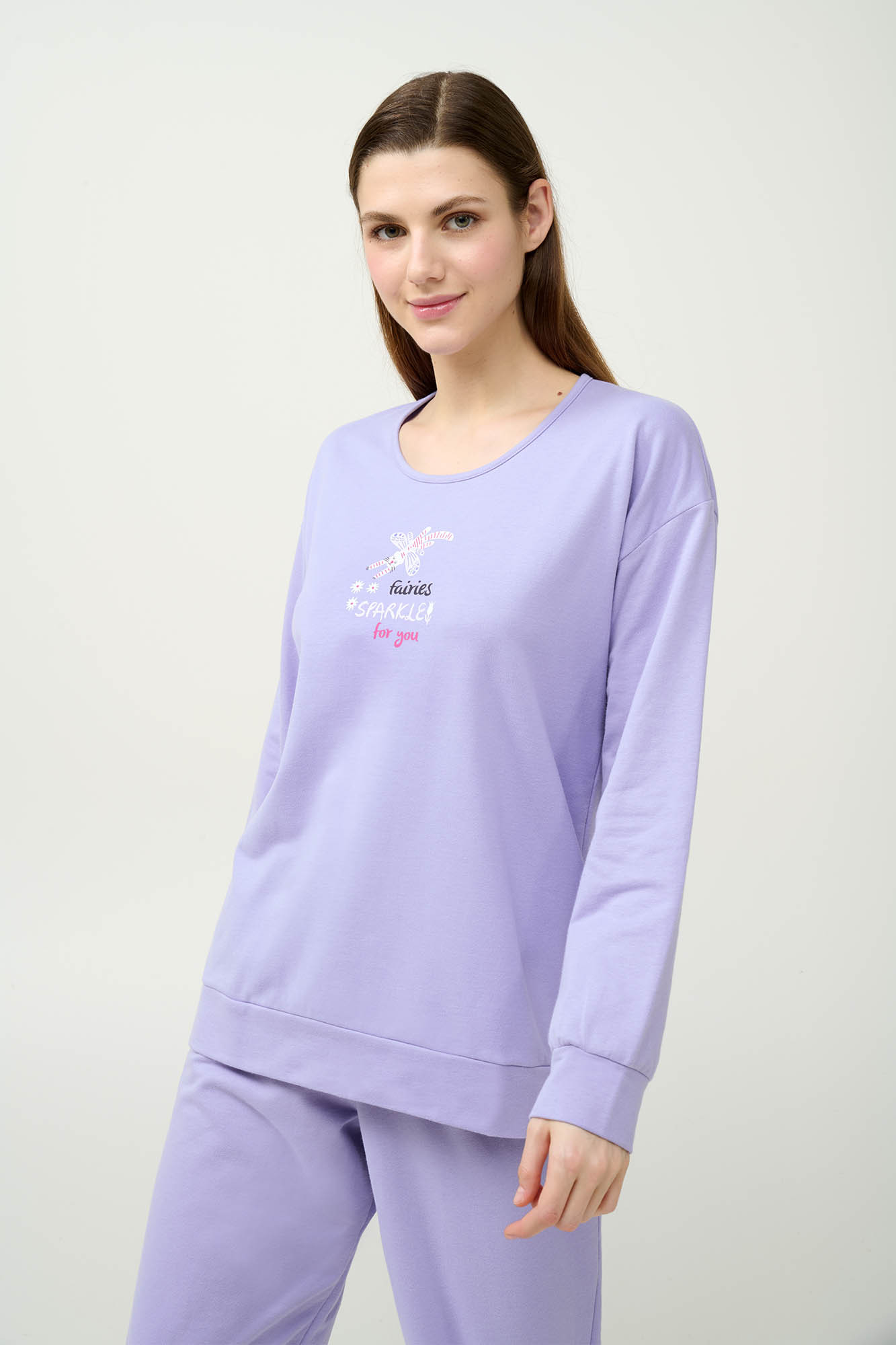 mikina zo 100% bavlny.Dĺžka vrchnej časti: 65 cm.Modelka má na sebe: Výška modelky: 175 cm.Udržujte si pohodlie s týmto dámskym zimným pyžamovým setom navrhnutým pre maximálne pohodlie. Tento set, ktorý obsahuje hladké nohavice s manžetami a zodpovedajúci vrchný diel s manžetami s roztomilou potlačou na prednej strane, spája štýl a teplo. Je vyrobený zo 100 % bavlneného flísu a poskytuje mäkký, priliehavý strih ideálny na chladné noci a lenivé rána. Pravidelný strih zaručuje ľahký pohyb a zároveň vás zahalí do tepla a pôvabu.