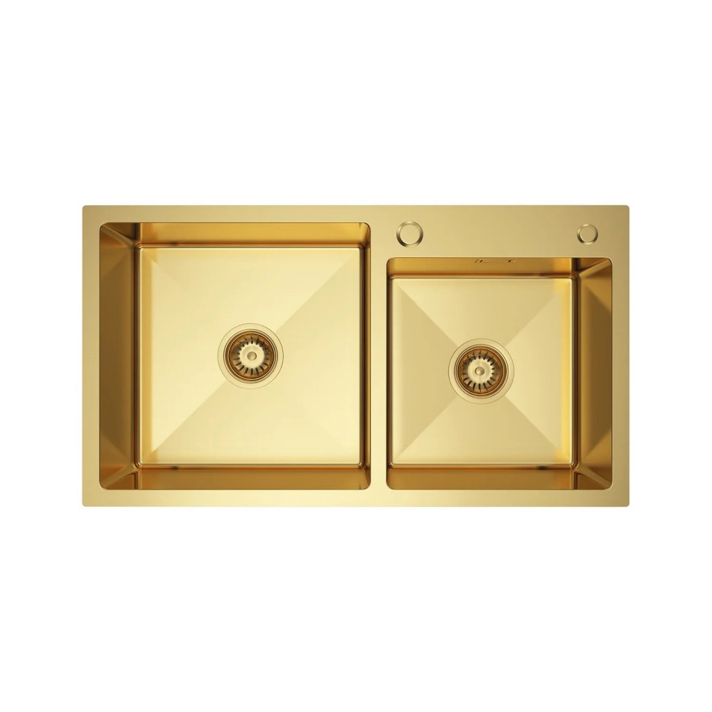 ● Spôsob montáže: zapustená● Typ: 2 drezy● Povrchová úprava ocele: kartáčovaný satén● Materiál: nerezová oceľ● Farba: zlatá PVD● Rozmery drezu: 780 mm x 450 mm x 210 mm● Rozmery drezu: 380 mm x 400 mm, 320 mm x 350 mm● Hrúbka kovu drezu: 0,8 mm● Hrúbka kovu okraja: 3 mm● Otvor pre batériu: Áno 35 mm● Prepadový otvor v dreze: Áno (GT)