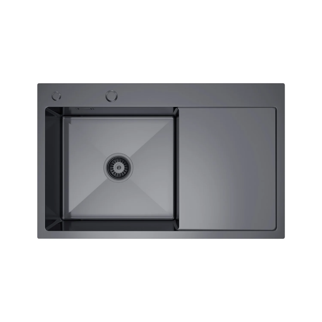 Spôsob montáže: Vstavaný Materiál: Nerezová oceľ Farba: Grafitové PVD Rozmery drezu: 780 mm x 490 mm x 210 mm Otvor pre kohútik: Áno, 35 mm Otvor pre dávkovač mydla: Áno, 28 mm Prepadový otvor v mise: Áno Odkvapkávač vpravo, misa vľavo(GT) Ean: 8596462648659