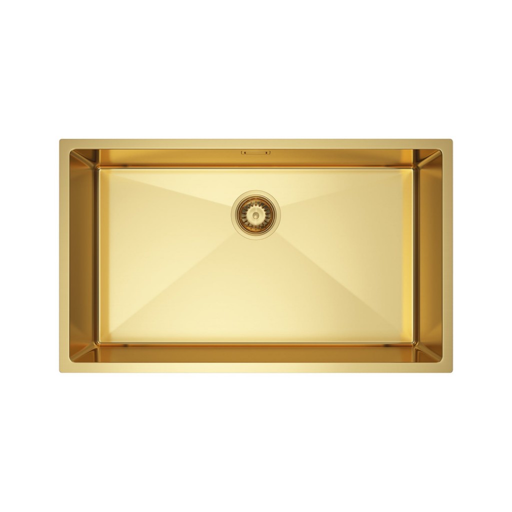 Spôsob montáže: Na dosku/pod dosku Materiál: Nerezová oceľ Oceľová povrchová úprava: Saténovo kartáčovaná s PVD povlakom Farba: zlatá PVD Rozmery drezu: 740 mm x 440 mm x 210 mm Rozmery komory: 700 mm x 400 mm Hrúbka kovu komory: 1 mm Hrúbka kovu ráfika: 3 mm Prepadový otvor komory: Áno Priemer odtoku: 90 mm (GT)
