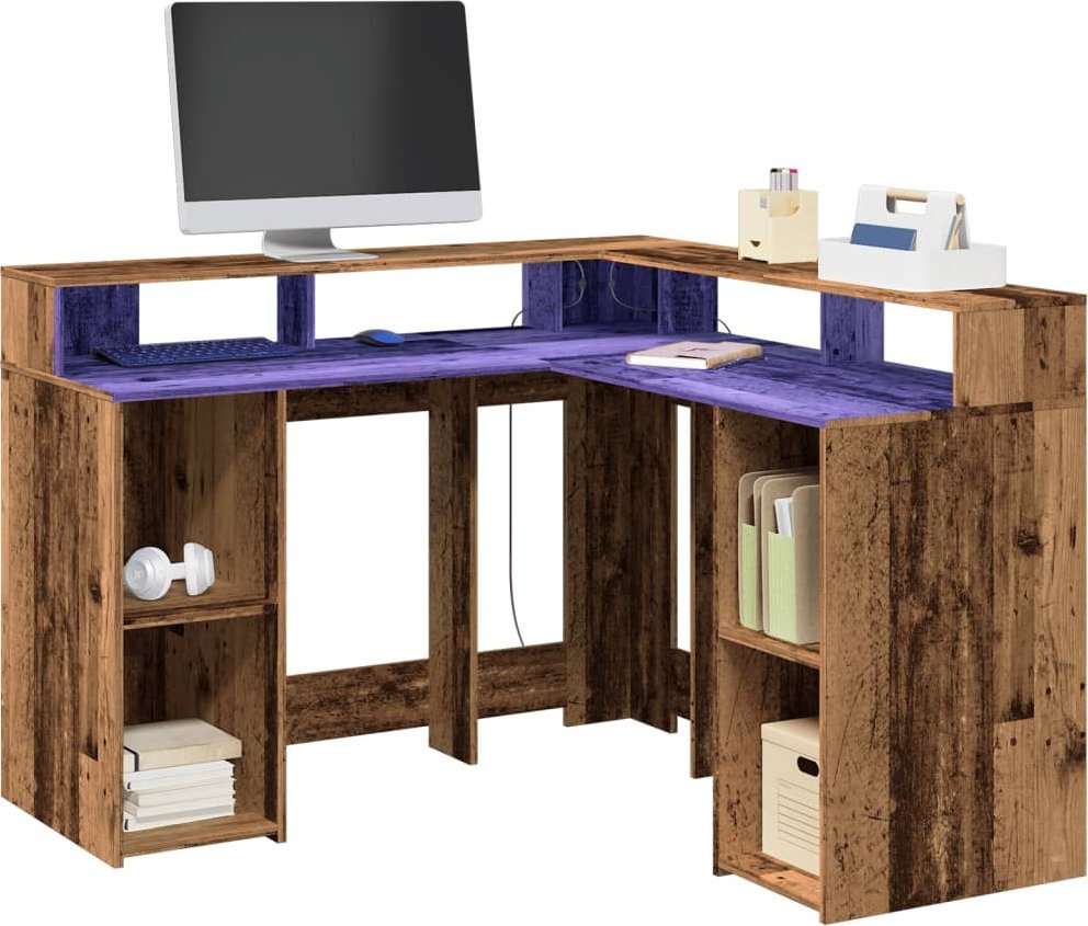 vidaXL Biurko z podświetleniem LED, stare drevo, 130x130x91 cm