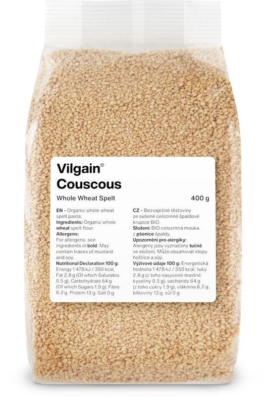 Vilgain Kuskus špaldový celozrnný BIO je komplexná sacharidová príloha z BIO celozrnnej špaldovej krupice.