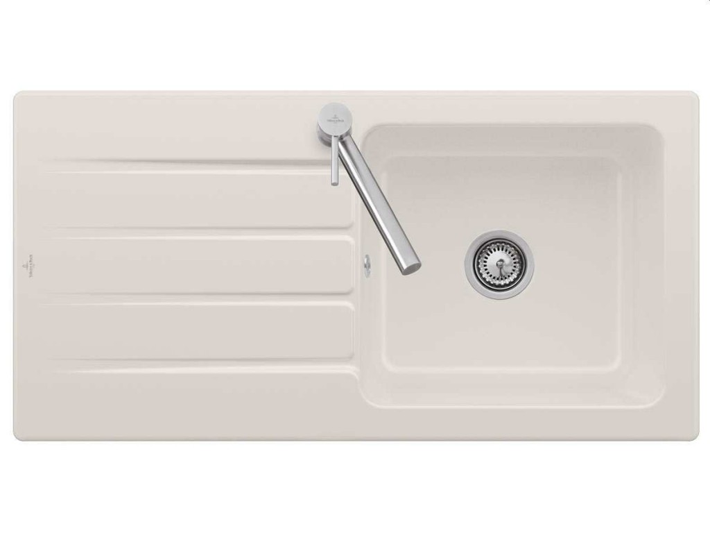 Keramický drez pre hornú montáž, bez excentra, farba Cream, šírka 100 cm Keramický drez Villeroy & Boch Architectura je vyrobený z materiálu CeramicPlus, ktorý zaisťuje výnimočnú tvrdosť, odolnosť proti poškriabaniu alebo inému poškodeniu a tiež odolnosť proti vysokým teplotám. Povrch je odolný voči cudzím látkam a nečistotám, takže sa výborne čistí a potraviny na ňom nezanechávajú žiadne stopy. Materiál CeramicPlus je vyrobený zo 100% prírodných materiálov, je farebne stály a neprijíma chute ani zápachy, takže ja absolútne nezávadný pre potraviny. Materiál: keramika s úpravou CeramicPlus Farba: Cream, lesklá Drez je určený pre hornú montáž na pracovnú dosku Drez je obojstranný - vanička môže byť napravo alebo naľavo Obsahuje odpadovú sadu bez excentra (ručné ovládanie výpuste) a sitko na nečistoty Sifón nie je súčasťou dodávky (možno doobjednať pod označením 94060000) Rozmery drezu (ŠxHxV): 1000 x 510 x 220 mm Rozmery výrezu (ŠxH): 970 x 480 mm Minimálna šírka skrinky: 600 mm Hmotnosť: 26,35 kg Pri objednávke uvádzajte číslo otvoru pre batériu - viď nákres Tento typ drezu sa vyrába vo farbách White alpin, Stone White, Cream, Ivory, Almond, Steam, Fossil, Stone, Graphite, Pure Black, Snow White, Timber, Chromite. Tento drez s odpadovou sadou s excentrom je na dopyt.(GT) Ean: 4051202537715