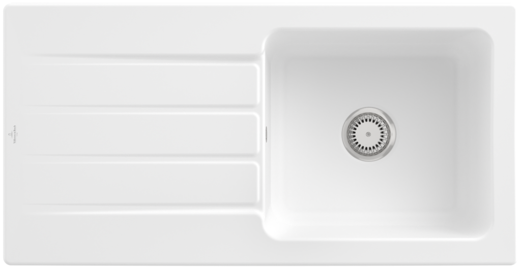 Keramický drez pre hornú montáž, bez excentra, farba Stone White, šírka 100 cm Keramický drez Villeroy & Boch Architectura je vyrobený z materiálu CeramicPlus, ktorý zaisťuje výnimočnú tvrdosť, odolnosť proti poškriabaniu alebo inému poškodeniu a tiež odolnosť proti vysokým teplotám. Povrch je odolný voči cudzím látkam a nečistotám, takže sa výborne čistí a potraviny na ňom nezanechávajú žiadne stopy. Materiál CeramicPlus je vyrobený zo 100% prírodných materiálov, je farebne stály a neprijíma chute ani zápachy, takže ja absolútne nezávadný pre potraviny. Materiál: keramika s úpravou CeramicPlus Farba: Stone white, biela matná Drez je určený pre hornú montáž na pracovnú dosku Drez je obojstranný - vanička môže byť napravo alebo naľavo Obsahuje odpadovú sadu bez excentra (ručné ovládanie výpuste) a sitko na nečistoty Sifón nie je súčasťou dodávky (možno doobjednať pod označením 94060000) Rozmery drezu (ŠxHxV): 1000 x 510 x 220 mm Rozmery výrezu (ŠxH): 970 x 480 mm Minimálna šírka skrinky: 600 mm Hmotnosť: 26,35 kg Pri objednávke uvádzajte číslo otvoru pre batériu - viď nákres Tento typ drezu sa vyrába vo farbách White alpin, Stone White, Cream, Ivory, Almond, Steam, Fossil, Stone, Graphite, Pure Black, Snow White, Timber, Chromite. Tento drez s odpadovou sadou s excentrom je na dopyt.(GT) Ean: 4051202946388