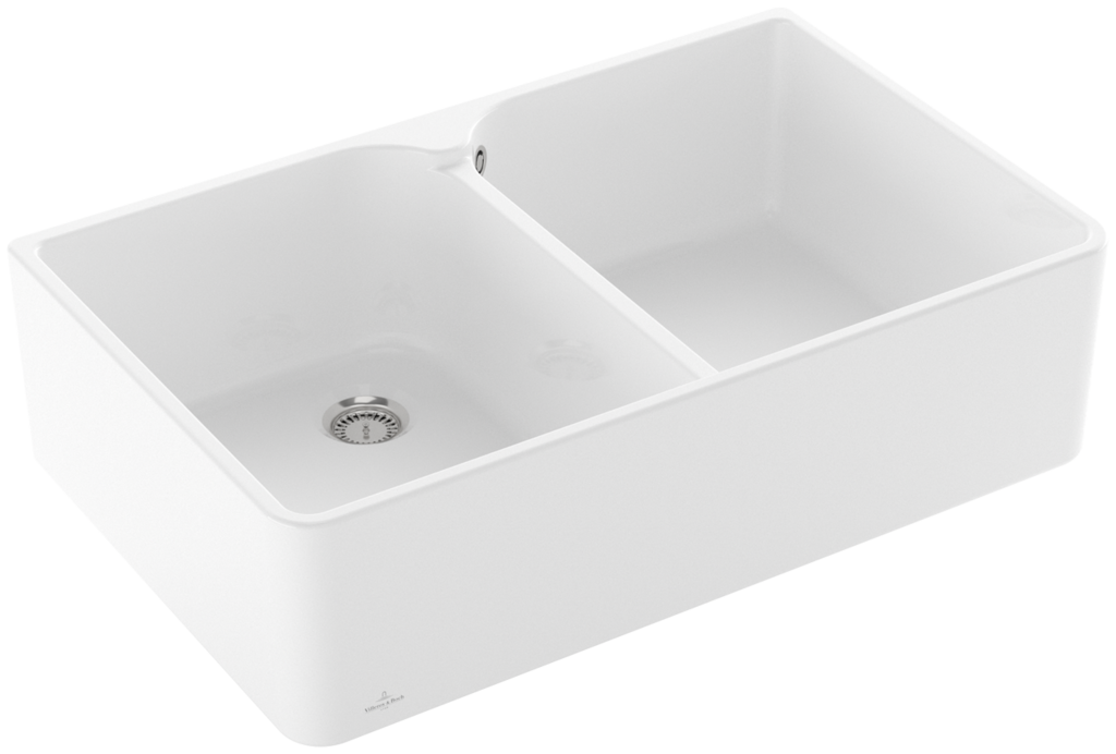 Keramický drez modulový, bez excentra, dve vaničky, farba Stone White, šírka 79,5 cm Keramický drez Villeroy & Boch Farmhouse je vyrobený z materiálu CeramicPlus, ktorý zaisťuje výnimočnú tvrdosť, odolnosť proti poškriabaniu alebo inému poškodeniu a tiež odolnosť proti vysokým teplotám. Povrch je odolný voči cudzím látkam a nečistotám, takže sa výborne čistí a potraviny na ňom nezanechávajú žiadne stopy. Materiál CeramicPlus je vyrobený zo 100% prírodných materiálov, je farebne stály a neprijíma chute ani zápachy, takže ja absolútne nezávadný pre potraviny. Materiál: keramika s úpravou CeramicPlus Farba: Stone White, biela matná Drez je určený na montáž na spodnú skrinku Zadná strana drezu nie je glazovaná Odporúča sa montáž do pracovnej dosky s prírodného alebo umelého kameňa, alebo z keramiky Obsahuje odpadovú sadu bez excentra (ručné ovládanie výpuste), sitko na nečistoty a sadu pre montáž na skrinku Sifón nie je súčasťou dodávky (možno doobjednať pod označením 94060000) Rozmery drezu (ŠxHxV): 795 x 500 x 220 mm Hĺbka vaničky 200 mm Minimálna šírka skrinky: 800 mm Hmotnosť: 34,9 kg Do drezu je možné z výroby pripraviť otvor č.1 dňa nákresu Tento drez sa vyrába vo farbách White alpin, Stone White, Cream a Pure Black. Drez s odpadovou sadou s excentrom je na dopyt.(GT) Ean: 4051202982065