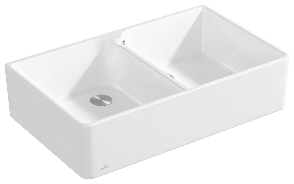 Keramický drez modulový, bez excentra, dve vaničky, farba White alpin, šírka 90 cm Keramický drez Villeroy & Boch Farmhouse je vyrobený z materiálu CeramicPlus, ktorý zaisťuje výnimočnú tvrdosť, odolnosť proti poškriabaniu alebo inému poškodeniu a tiež odolnosť proti vysokým teplotám. Povrch je odolný voči cudzím látkam a nečistotám, takže sa výborne čistí a potraviny na ňom nezanechávajú žiadne stopy. Materiál CeramicPlus je vyrobený zo 100% prírodných materiálov, je farebne stály a neprijíma chute ani zápachy, takže ja absolútne nezávadný pre potraviny. Materiál: keramika s úpravou CeramicPlus Farba: White alpin, biela lesklá Drez je určený na montáž na spodnú skrinku Zadná strana drezu nie je glazovaná Odporúča sa montáž do pracovnej dosky s prírodného alebo umelého kameňa, alebo z keramiky Obsahuje odpadovú sadu bez excentra (ručné ovládanie výpuste), sitko na nečistoty a sadu pre montáž na skrinku Sifón nie je súčasťou dodávky (možno doobjednať pod označením 94060000) Rozmery drezu (ŠxHxV): 905 x 550 x 220 mm Hĺbka vaničky 200 mm Minimálna šírka skrinky: 900 mm Hmotnosť: 41,48 kg Do drezu je možné z výroby pripraviť otvor č.1 dňa nákresu Tento drez sa vyrába vo farbách White alpin, Stone White, Cream a Pure Black. Drez s odpadovou sadou s excentrom je na dopyt.(GT) Ean: 4051202981952