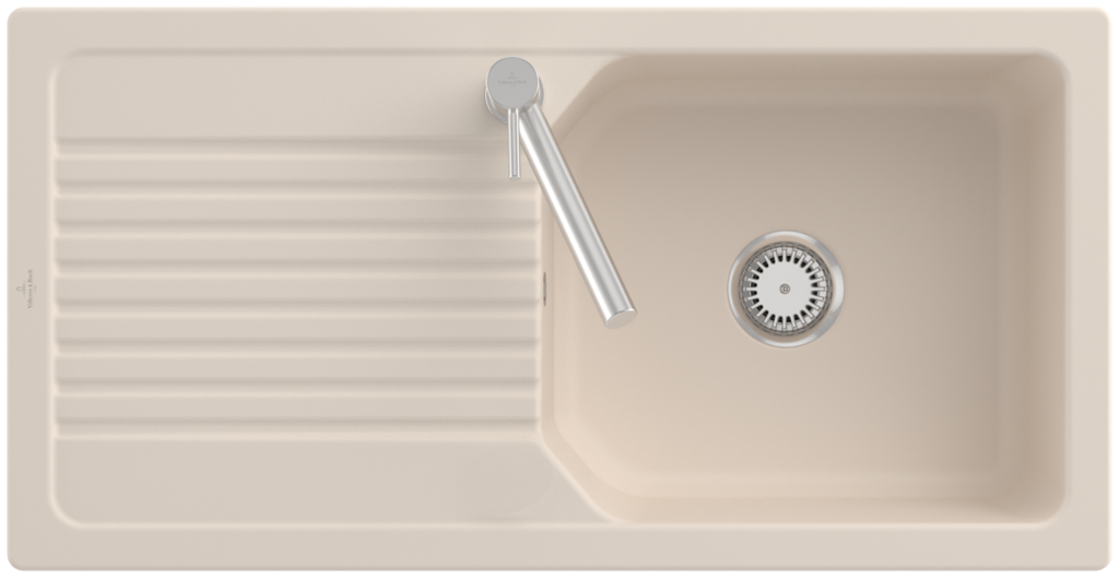 Keramický drez pre hornú montáž, bez excentru, farba Ivory, šírka 100 cm Keramický drez Villeroy & Boch Linara je vyrobený z materiálu CeramicPlus, ktorý zaisťuje výnimočnú tvrdosť, odolnosť proti poškriabaniu alebo inému poškodeniu a tiež odolnosť proti vysokým teplotám. Povrch je odolný voči cudzím látkam a nečistotám, takže sa výborne čistí a potraviny na ňom nezanechávajú žiadne stopy. Materiál CeramicPlus je vyrobený zo 100% prírodných materiálov, je farebne stály a neprijíma chute ani zápachy, takže ja absolútne nezávadný pre potraviny. Materiál: keramika s úpravou CeramicPlus Farba: Ivory, matná Drez je určený pre hornú montáž na pracovnú dosku Drez je obojstranný - vanička môže byť napravo alebo naľavo Obsahuje odpadovú sadu bez excentra (ručné ovládanie výpuste) a sitko na nečistoty Sifón nie je súčasťou dodávky (možno doobjednať pod označením 94060000) Rozmery drezu (ŠxHxV): 1000 x 510 x 200 mm Rozmery výrezu (ŠxH): 970 x 480 mm Minimálna šírka skrinky: 600 mm Hmotnosť: 24 kg Pri objednávke uvádzajte číslo otvoru pre batériu - viď nákres Tento typ drezu sa vyrába vo farbách White alpin, Stone White, Cream, Ivory, Almond, Steam, Fossil, Stone, Graphite, Pure Black, Snow White, Timber, Chromite. Tento drez s odpadovou sadou s excentrom je na dopyt.(GT) Ean: 4065467435860