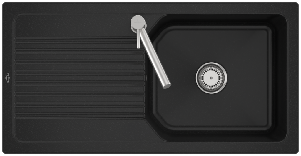 Keramický drez pre hornú montáž, bez excentra, farba Chromit, šírka 100 cm Keramický drez Villeroy & Boch Linara je vyrobený z materiálu CeramicPlus, ktorý zaisťuje výnimočnú tvrdosť, odolnosť proti poškriabaniu alebo inému poškodeniu a tiež odolnosť proti vysokým teplotám. Povrch je odolný voči cudzím látkam a nečistotám, takže sa výborne čistí a potraviny na ňom nezanechávajú žiadne stopy. Materiál CeramicPlus je vyrobený zo 100% prírodných materiálov, je farebne stály a neprijíma chute ani zápachy, takže ja absolútne nezávadný pre potraviny. Materiál: keramika s úpravou CeramicPlus Farba: Chromit, čierna lesklá Drez je určený pre hornú montáž na pracovnú dosku Drez je obojstranný - vanička môže byť napravo alebo naľavo Obsahuje odpadovú sadu bez excentra (ručné ovládanie výpuste) a sitko na nečistoty Sifón nie je súčasťou dodávky (možno doobjednať pod označením 94060000) Rozmery drezu (ŠxHxV): 1000 x 510 x 200 mm Rozmery výrezu (ŠxH): 970 x 480 mm Minimálna šírka skrinky: 600 mm Hmotnosť: 24 kg Pri objednávke uvádzajte číslo otvoru pre batériu - viď nákres Tento typ drezu sa vyrába vo farbách White alpin, Stone White, Cream, Ivory, Almond, Steam, Fossil, Stone, Graphite, Pure Black, Snow White, Timber, Chromite. Tento drez s odpadovou sadou s excentrom je na dopyt.(GT) Ean: 4065467435761