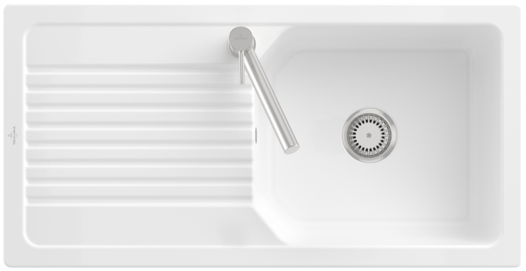 Keramický drez pre hornú montáž, bez excentru, farba White alpin, šírka 100 cm Keramický drez Villeroy & Boch Linara je vyrobený z materiálu CeramicPlus, ktorý zaisťuje výnimočnú tvrdosť, odolnosť proti poškriabaniu alebo inému poškodeniu a tiež odolnosť proti vysokým teplotám. Povrch je odolný voči cudzím látkam a nečistotám, takže sa výborne čistí a potraviny na ňom nezanechávajú žiadne stopy. Materiál CeramicPlus je vyrobený zo 100% prírodných materiálov, je farebne stály a neprijíma chute ani zápachy, takže ja absolútne nezávadný pre potraviny. Materiál: keramika s úpravou CeramicPlus Farba: White alpin (alpská biela), lesklá Drez je určený pre hornú montáž na pracovnú dosku Drez je obojstranný - vanička môže byť napravo alebo naľavo Obsahuje odpadovú sadu bez excentra (ručné ovládanie výpuste) a sitko na nečistoty Sifón nie je súčasťou dodávky (možno doobjednať pod označením 94060000) Rozmery drezu (ŠxHxV): 1000 x 510 x 200 mm Rozmery výrezu (ŠxH): 970 x 480 mm Minimálna šírka skrinky: 600 mm Hmotnosť: 24 kg Pri objednávke uvádzajte číslo otvoru pre batériu - viď nákres Tento typ drezu sa vyrába vo farbách White alpin, Stone White, Cream, Ivory, Almond, Steam, Fossil, Stone, Graphite, Pure Black, Snow White, Timber, Chromite. Tento drez s odpadovou sadou s excentrom je na dopyt.(GT) Ean: 4065467435808