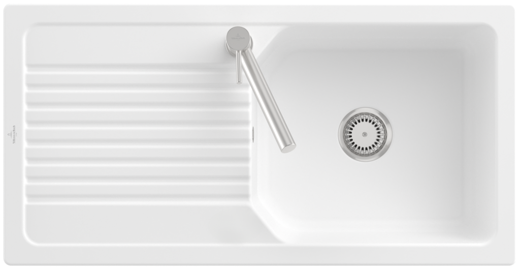 Keramický drez pre hornú montáž, bez excentra, farba Stone white, šírka 100 cm Keramický drez Villeroy & Boch Linara je vyrobený z materiálu CeramicPlus, ktorý zaisťuje výnimočnú tvrdosť, odolnosť proti poškriabaniu alebo inému poškodeniu a tiež odolnosť proti vysokým teplotám. Povrch je odolný voči cudzím látkam a nečistotám, takže sa výborne čistí a potraviny na ňom nezanechávajú žiadne stopy. Materiál CeramicPlus je vyrobený zo 100% prírodných materiálov, je farebne stály a neprijíma chute ani zápachy, takže ja absolútne nezávadný pre potraviny. Materiál: keramika s úpravou CeramicPlus Farba: Stone white, biela matná Drez je určený pre hornú montáž na pracovnú dosku Drez je obojstranný - vanička môže byť napravo alebo naľavo Obsahuje odpadovú sadu bez excentra (ručné ovládanie výpuste) a sitko na nečistoty Sifón nie je súčasťou dodávky (možno doobjednať pod označením 94060000) Rozmery drezu (ŠxHxV): 1000 x 510 x 200 mm Rozmery výrezu (ŠxH): 970 x 480 mm Minimálna šírka skrinky: 600 mm Hmotnosť: 24 kg Pri objednávke uvádzajte číslo otvoru pre batériu - viď nákres Tento typ drezu sa vyrába vo farbách White alpin, Stone White, Cream, Ivory, Almond, Steam, Fossil, Stone, Graphite, Pure Black, Snow White, Timber, Chromite. Tento drez s odpadovou sadou s excentrom je na dopyt.(GT) Ean: 4065467435822