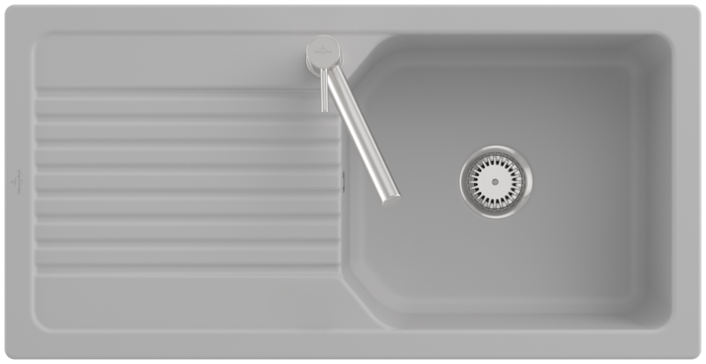 Keramický drez pre hornú montáž, bez excentra, farba Steam, šírka 100 cm Keramický drez Villeroy & Boch Linara je vyrobený z materiálu CeramicPlus, ktorý zaisťuje výnimočnú tvrdosť, odolnosť proti poškriabaniu alebo inému poškodeniu a tiež odolnosť proti vysokým teplotám. Povrch je odolný voči cudzím látkam a nečistotám, takže sa výborne čistí a potraviny na ňom nezanechávajú žiadne stopy. Materiál CeramicPlus je vyrobený zo 100% prírodných materiálov, je farebne stály a neprijíma chute ani zápachy, takže ja absolútne nezávadný pre potraviny. Materiál: keramika s úpravou CeramicPlus Farba: Steam, matná Drez je určený pre hornú montáž na pracovnú dosku Drez je obojstranný - vanička môže byť napravo alebo naľavo Obsahuje odpadovú sadu bez excentra (ručné ovládanie výpuste) a sitko na nečistoty Sifón nie je súčasťou dodávky (možno doobjednať pod označením 94060000) Rozmery drezu (ŠxHxV): 1000 x 510 x 200 mm Rozmery výrezu (ŠxH): 970 x 480 mm Minimálna šírka skrinky: 600 mm Hmotnosť: 24 kg Pri objednávke uvádzajte číslo otvoru pre batériu - viď nákres Tento typ drezu sa vyrába vo farbách White alpin, Stone White, Cream, Ivory, Almond, Steam, Fossil, Stone, Graphite, Pure Black, Snow White, Timber, Chromite. Tento drez s odpadovou sadou s excentrom je na dopyt.(GT) Ean: 4065467435846