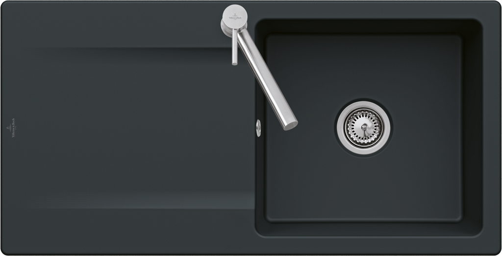 Keramický drez pre hornú montáž, bez excentra, farba Pure Black, šírka 100 cm (nástupca za 333601S5, Ebony) Keramický drez Villeroy & Boch Siluet je vyrobený z materiálu TitanCeram, ktorý zaisťuje výnimočnú tvrdosť, odolnosť proti poškriabaniu alebo inému poškodeniu a tiež odolnosť proti vysokým teplotám. Povrch je odolný voči cudzím látkam a nečistotám, takže sa výborne čistí a potraviny na ňom nezanechávajú žiadne stopy. Materiál CeramicPlus je vyrobený zo 100% prírodných materiálov, je farebne stály a neprijíma chute ani zápachy, takže ja absolútne nezávadný pre potraviny. Materiál: keramika s úpravou TitanCeram Farba: Pure Black, matná Drez je určený pre hornú montáž na pracovnú dosku Drez je obojstranný - vanička môže byť napravo alebo naľavo Obsahuje odpadovú sadu bez excentra (ručné ovládanie výpuste) a sitko na nečistoty Sifón nie je súčasťou dodávky (možno doobjednať pod označením 94060000) Rozmery drezu (ŠxHxV): 1000 x 510 x 220 mm Rozmery výrezu (ŠxH): 970 x 480 mm Minimálna šírka skrinky: 600 mm Hmotnosť: 26,4 kg Pri objednávke uvádzajte číslo otvoru pre batériu - viď nákres Tento typ drezu sa vyrába vo farbách White alpin, Stone White, Cream, Ivory, Almond, Steam, Fossil, Stone, Graphite, Pure Black, Snow White, Timber, Chromite. Tento drez s odpadovou sadou s excentrom je na dopyt.(GT) Ean: 4051202797645