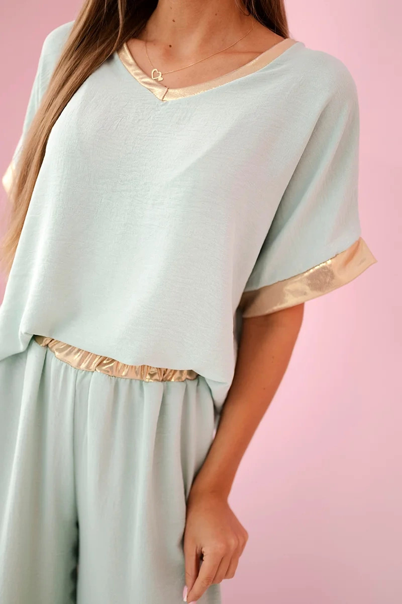 Domov Oblečenie a móda Dámske oblečenie Dámske blúzky a košele Viskózová súprava so zlatým lemovaním tmavá mentolová UNI