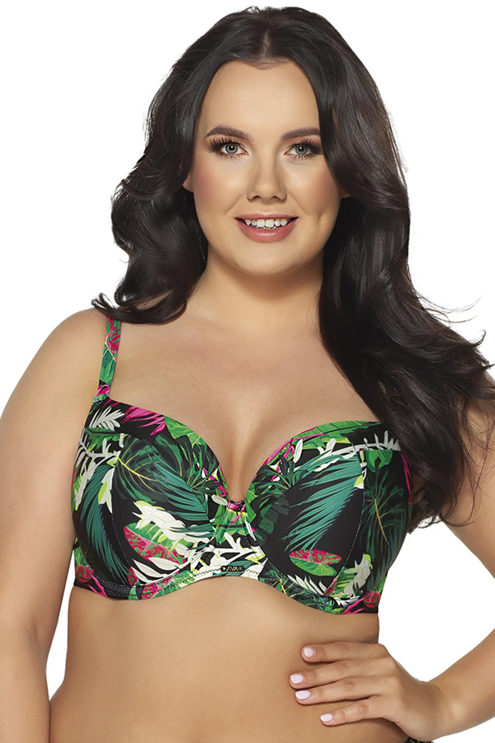Dámsky vrchný diel plaviek Ava. Model SK-201. Produkt pre ženy. Podprsenka je vystužená, s kosticami. Popruhy nie sú odnímateľné, ale sú posuvné. Zapínanie na zadnej strane pomocou kovovej spony. Zloženie materiálu: 80% polyamid, 20% elastan