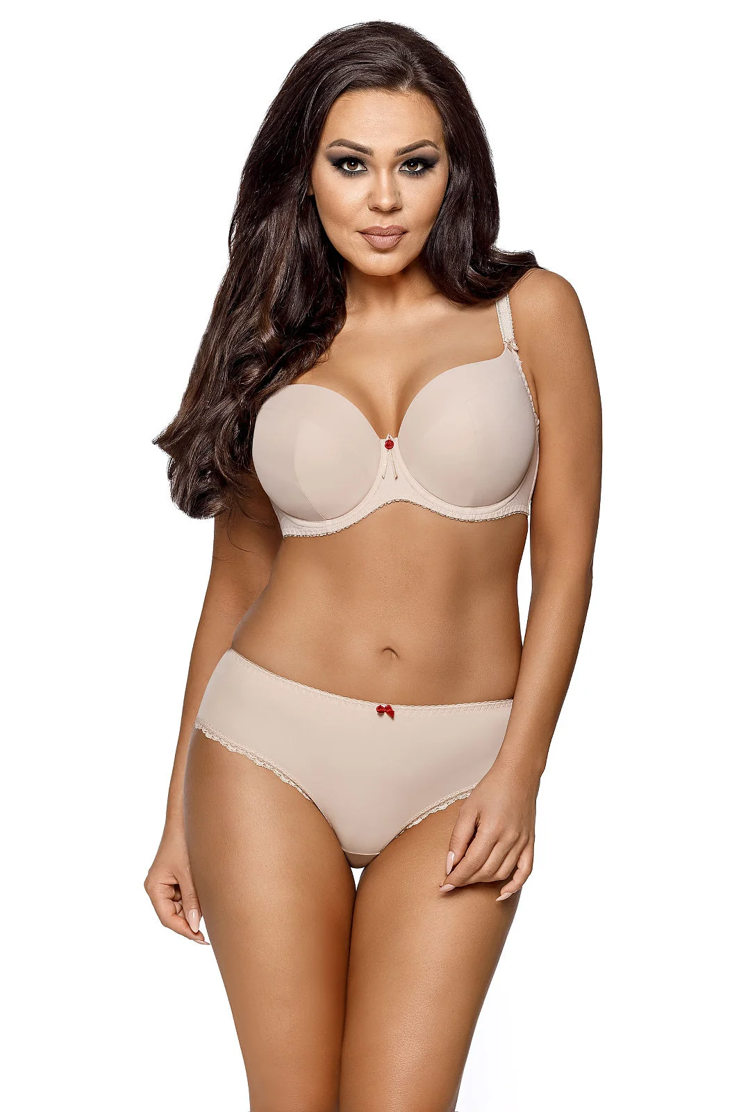 Vystužená podprsenka so zvislým a šikmým strihom. Ušitá je z hladkého mikrovlákna. Medzi košíčkami je saténová mašlička. Boky sú spevnené zvislou kosticou. Ramienka sú neodopínacie. Model dobre podopiera a dvíha prsia.